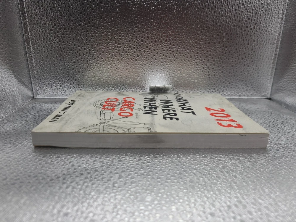 The "Burning Man 2013 Cargo Cult Who, What, When, Where Guide" is a detailed guide providing information on the Burning Man event in 2013, specifically focusing on the theme of Cargo Cult. It includes details on who will be attending, what activities and art installations will be present, the schedule of events, and the location of the event. Some signs of age and regular use