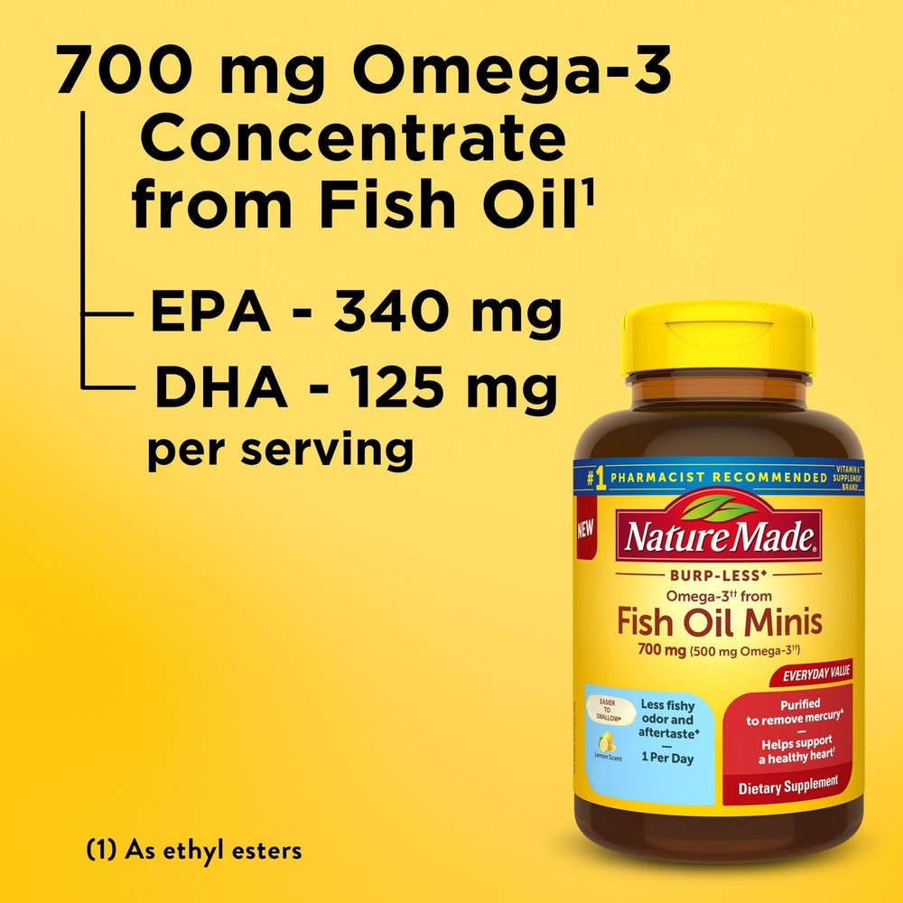 Made Burp Less (3) -3 (1) from Fish Oil Minis 700 mg Softgels, lemon scent, are dietary supplements formulated to help support a healthy heart. Sourced from high quality ingredients, this Made 3 Fish Oil for men and women is a gluten free 3 supplement that has no color added, no milk and no shellfish. Offering 700mg -3 (1) concentrate from Fish Oil (EPA - 340 mg, DHA - 125 mg) per softgel, these Made -3 (1) from Fish Oil supplements are easier to swallow (4). For those who don’t consume fish regularly, a Fish Oil for women and men like this Made 3 fish oil supplement (1) can help provide 3s. Adults, take one softgel daily with water and a meal for optimal absorption. Supportive but not conclusive research shows that consumption of EPA and DHA -3 fatty acids may reduce the risk of coronary heart disease. (See nutrition information for total fat and cholesterol content). Made Fish Oil 3 supplements (1) are quality you can trust. (1)As ethyl esters (2)Purified to remove PCBs, dioxins and furans, and mercury to levels below 0.09 ppm, 2 ppt WHO TEQs, and 0.1 ppm respectively. (3) Specially made to reduce fishy odor and aftertaste, and fishy burps. (4)Easier to swallow compared to original Made Mini -3(1) softgel. *Based on a 2022 survey of pharmacists who recommend branded vitamins and supplements. CAUTION: If you are pregnant, nursing, taking medications, or have blood clotting issues, consult your physician before use. Heart health support supplement: contains one 120 count bottle of Made Burp Less -3 (1) from Fish Oil Minis 700 mg Softgels for a 120-day supply -3 (1) from Fish Oil mini softgels are purified to remove mercury (2), specially made to reduce fishy burps, and easier to swallow (4) One daily Fish Oil Made 3 (1) mini softgel provides 340 mg of EPA and 125 mg of DHA to support a healthy heart Adults, take one of these Made 3 (1) from Fish Oil softgels daily with water and a meal for optimal absorption These gluten free 3 mini Fish Oil softgels have no color added, no milk and no shellfish #1 Pharmacist Recommended Vitamin and Supplement Brand* These statements have not been evaluated by the Food and Drug Administration; this product is not intended to diagnose, treat, cure, or prevent any disease