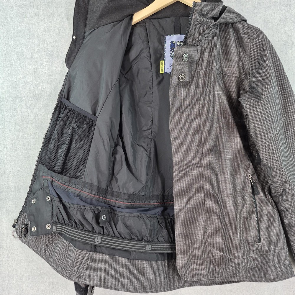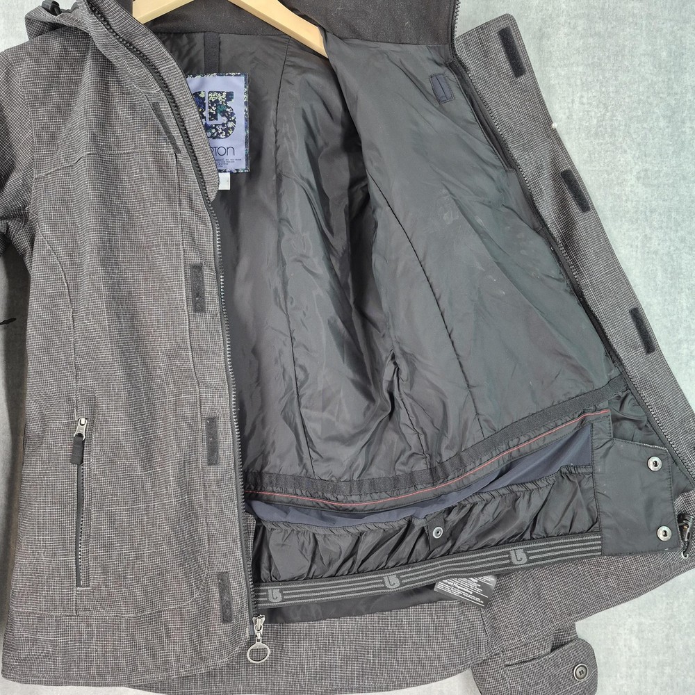 Welcome to Aspen Crossing, your place to shop for men’s modern rustic western wear and refined leisure styles reflecting the rugged beauty of our American West Burton Jacket Mens Small Gray DRYRIDE Hooded Insulated Ski Snowboarding Plaid Brand: Burton. Item: Mens hooded insulated ski and snowboard jacket. Gender/Size: Mens Small (S), as indicated on the interior size label. Although the tag indicates the size , please compare the actual measurements in the photos above with one of your own garments to ensure a correct fit. This garment length is measured from the top of the shoulder to the hem, chest from underarm to underarm, shoulder width from shoulder seam left to right and sleeve length from top of shoulder to cuff Color: Gray mini check plaid pattern. Material: Shell 100% polyester with polyurethane membrane; insulation 100% polyester; lining includes polyester with nylon taffeta and mesh panels. Country of origin: Made in Vietnam. Style/Model identifiers: Burton Dryride line; style WB JET SET JK; RN 87380; CA 26037. Features: Full front zipper with large ring pull and snap storm placket, attached hood with high stand collar, two front zip hand pockets, interior mesh and slip pockets, adjustable hook-and-loop tab cuffs with Burton logo embroidery, integrated powder skirt with snap closures and gripper hem, and hip-length insulated construction suitable for skiing, snowboarding, or other cold-weather outdoor activities. Care: Machine wash cold (below 30°C) using powder detergent; wash separately, rinse thoroughly, do not use fabric softener, and periodically replenish the water-repellent finish with spray-on treatment only (per care label instructions). Notes: Measurements are shown in photos for reference; color may vary slightly due to lighting and monitor settings.