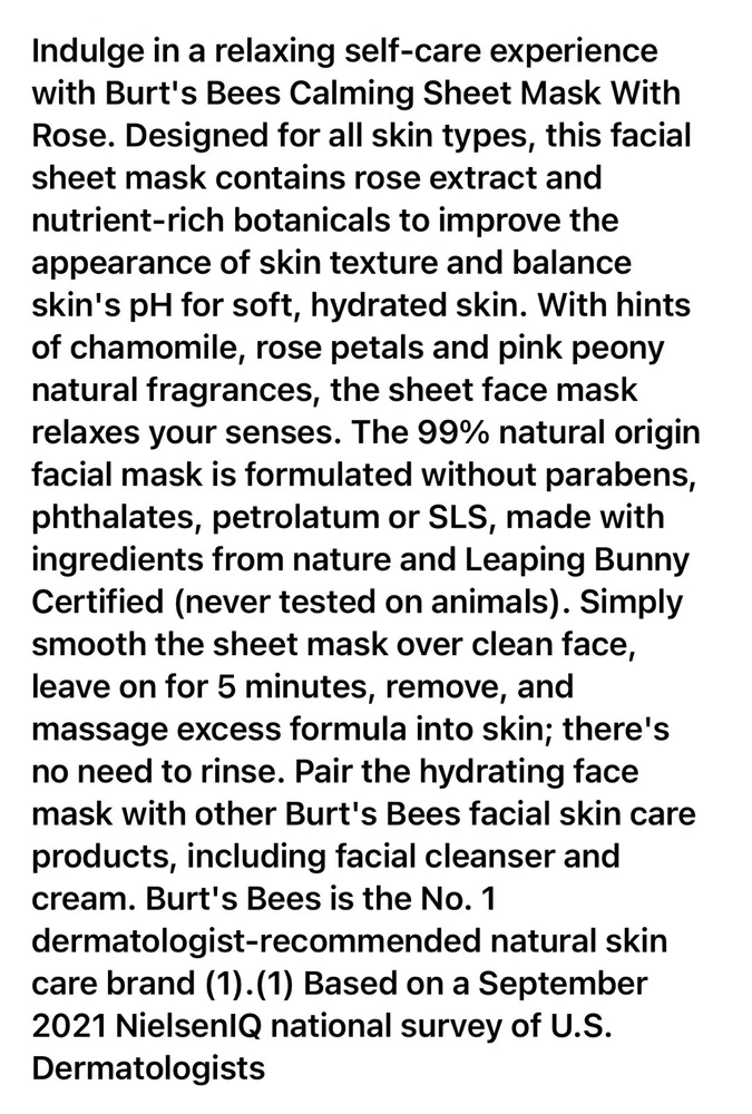NEW-Factory Sealed (Lot of 4) Includes: (4) Individually Packaged BURT’S BEE’S Calming Sheet Mask Rose Single Use Sheet Mask Please see pictures for more details 😁