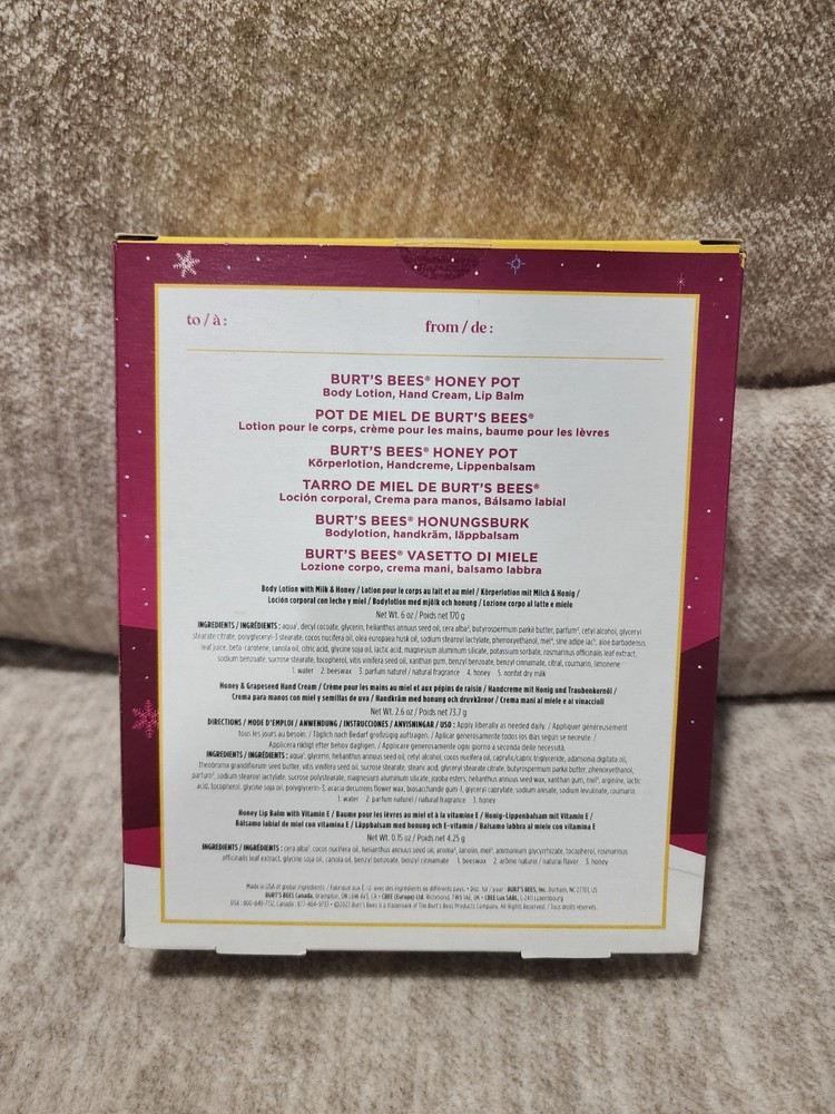 Burt’s Bees Honey Pot 3 Pc Pamper Gift Set Body Lotion Hand Cream Lip Balm New.