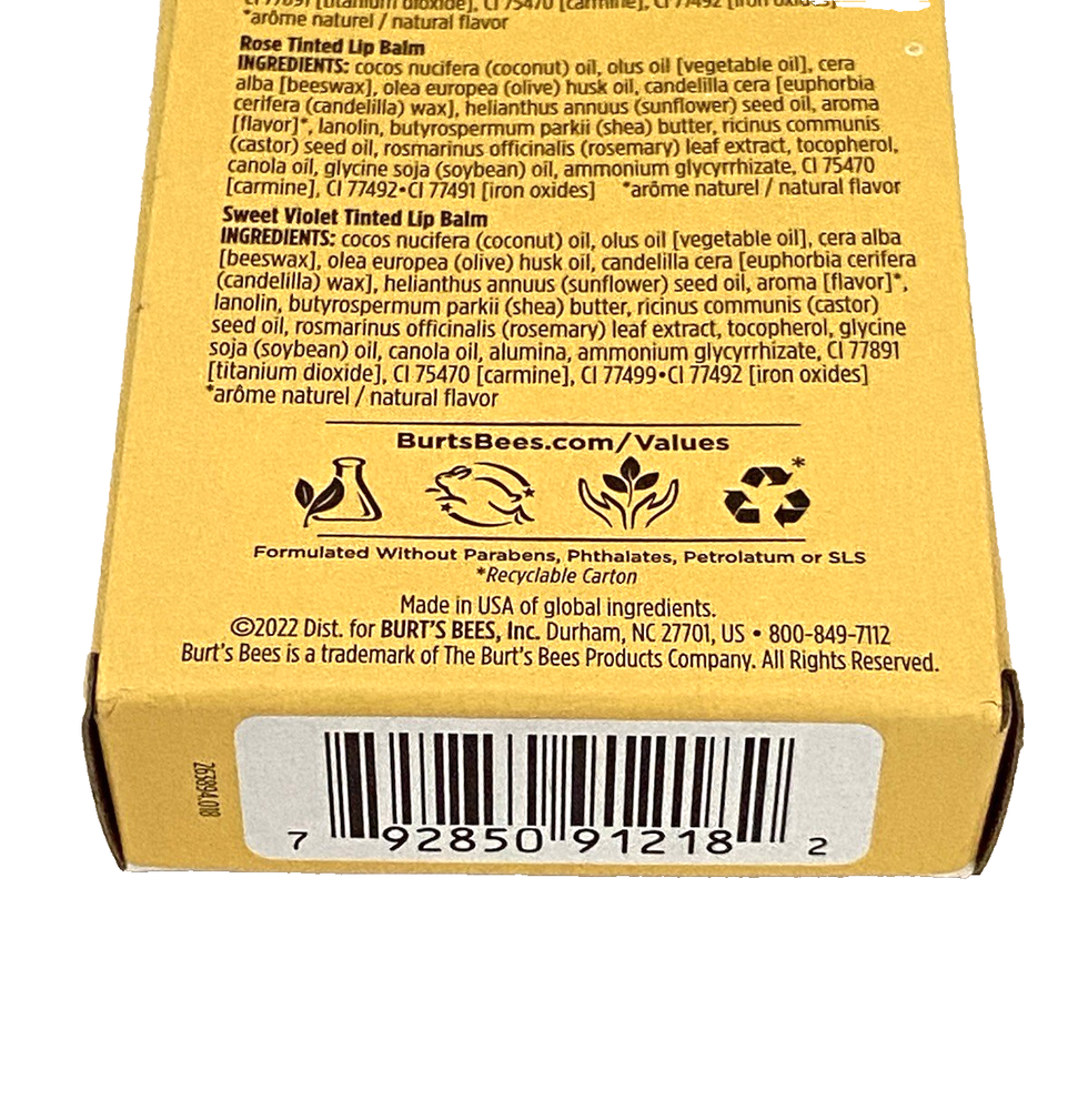 This set includes three flattering shades—Sweet Violet, Rose, and Pink Blossom—that provide a hint of color while moisturizing and softening your lips. Formulated with 100% natural ingredients, these balms are free from parabens, phthalates, petrolatum, and SLS, ensuring gentle care for your lips. Active Ingredients: None (This product does not contain active medicinal ingredients). Inactive Ingredients: Beeswax, Cocos Nucifera (Coconut) Oil, Helianthus Annuus (Sunflower) Seed Oil, Ricinus Communis (Castor) Seed Oil, Lanolin, Aroma (Flavor), Limonene, Linalool, Eugenol, Geraniol, Citral, Citronellol, Benzyl Benzoate, Benzyl Alcohol, Tocopherol, Rosmarinus Officinalis (Rosemary) Leaf Extract, Glycine Soja (Soybean) Oil, Canola Oil, Cinnamal, Cinnamyl Alcohol, Coumarin, Farnesol, Isoeugenol, Benzyl Salicylate, CI 77891 (Titanium Dioxide), CI 77491, CI 77492, CI 77499 (Iron Oxides), CI 75470 (Carmine). Disclaimer: For the most accurate and up-to-date information, please refer to the original product packaging. Manufacturers may update ingredients or formulations without prior notice. Features: Quantity: 3 Tinted Lip Balms Shades Included: Sweet Violet, Rose, Pink Blossom Net Weight: 0.15 oz (4.25 g) each 100% Natural Origin: Formulated without parabens, phthalates, petrolatum, or SLS Moisturizing Formula: Enriched with shea butter and botanical waxes for soft, hydrated lips UPC: 792850912182 Condition: Brand New California Proposition 65 Warning: If you are purchasing from the state of California, please review your local laws and site policies before placing your order. Certain products may be subject to restrictions, warnings, or special requirements under California state regulations, including Proposition 65. For more information, please visit the official California government site: www.P65Warnings.ca.gov Disclaimer: This product is authentic. We are not affiliated with or endorsed by the brand mentioned. All trademarks are the property of their respective owners and are used only to describe the item being sold.