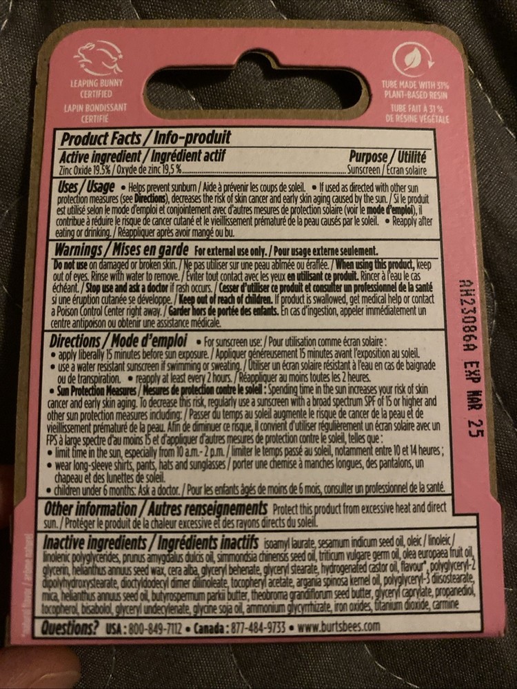 Burt's Bees Tinted Lip Balm SPF 30 in Wild Peony is a 100% natural lip balm with a beautiful pink tint. Made with Shea Butter, this lip balm is perfect for sensitive skin and provides SPF 30 sun protection. Unscented and with a rose scent, it is a perfect gift for Mother's Day. The solid stick formulation ensures easy application and long-lasting moisture for your lips. Made in Canada, this lip balm is a must-have for anyone looking to treat their dry lips with a natural and effective product. Expiration date March 2025 I have 8 left