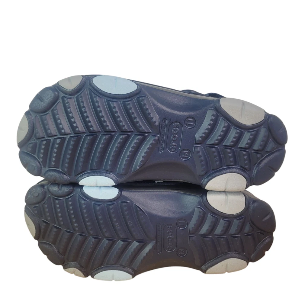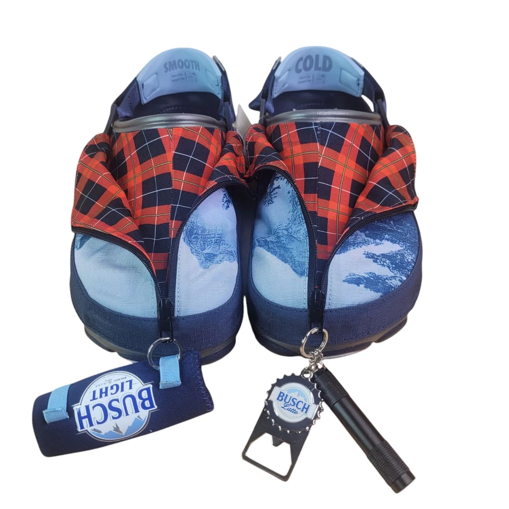 Busch Light Beer x Crocs Men's 11 All Terrain Clogs Bottle Opener Light Koozie These Crocs x Busch Light collaboration clogs are designed for men in a size 11. They feature a solid blue color with a slip-on closure and a bottle opener and light koozie accent. Ideal for casual occasions, these limited edition clogs are lightweight and comfortable, with an adjustable strap for a secure fit. Perfect for outdoor activities, they showcase the iconic Busch Light logo and are suitable for wearing in the summer, fall, and spring seasons. Made with rubber outsole material, these USA-themed clogs are a fun and functional choice for fans of Busch Light beer.