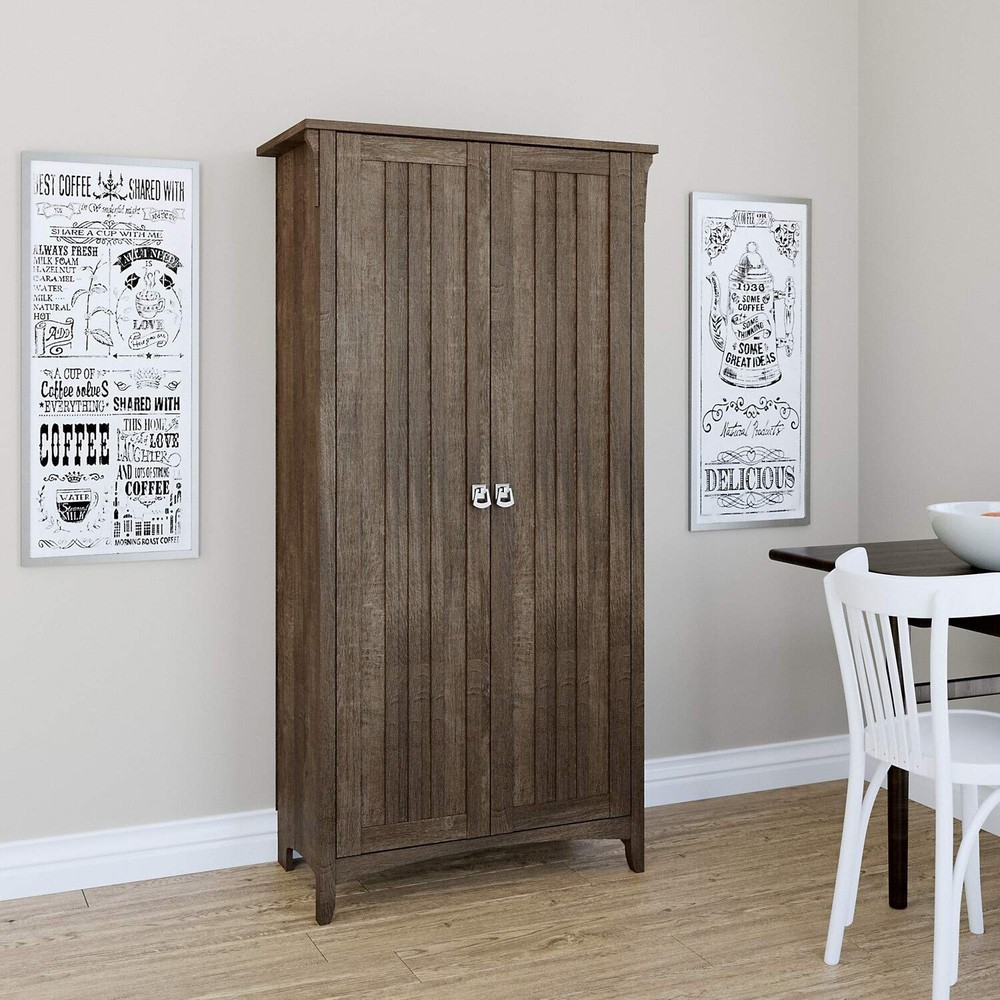 32W x 16D x 63H Storage Cabinet includes five shelves for organizing a kitchen pantry or dining room Three adjustable shelves accommodate items of various sizes while two fixed shelves provide stability Each of the Pantry Cabinet's shelves supports up to 50 pounds Doors open on smooth Euro style hinges for easy access to food, utensils, dinnerware and other kitchen supplies Distressed finish options include a cream colored Antique White, Pure White with Shiplap Gray, Cape Cod Gray, Vintage Black, Ash Brown, Reclaimed Pine and Driftwood Gray