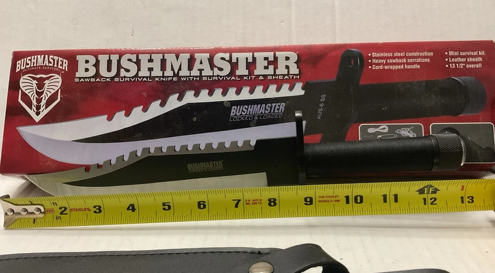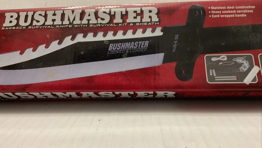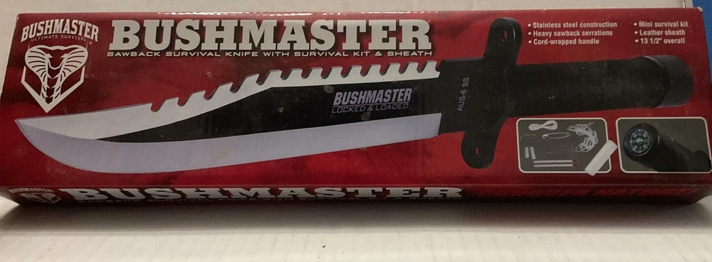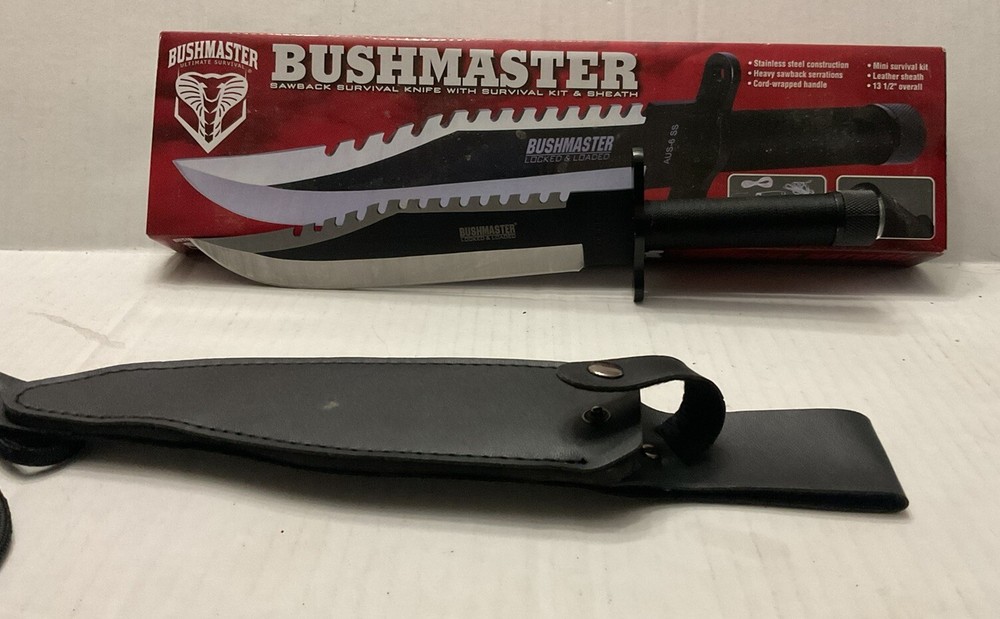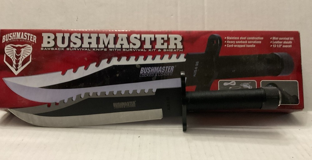 The Bushmaster BK2850 #753 is a modern fixed blade knife designed for survival situations. Known for their durability and quality, Bushmaster knives are a popular choice for outdoor enthusiasts and collectors alike. This specific model is designed to be reliable and efficient in various survival scenarios, making it a valuable addition to any knife collection. See photos. Never used. Taken from box for pictures.