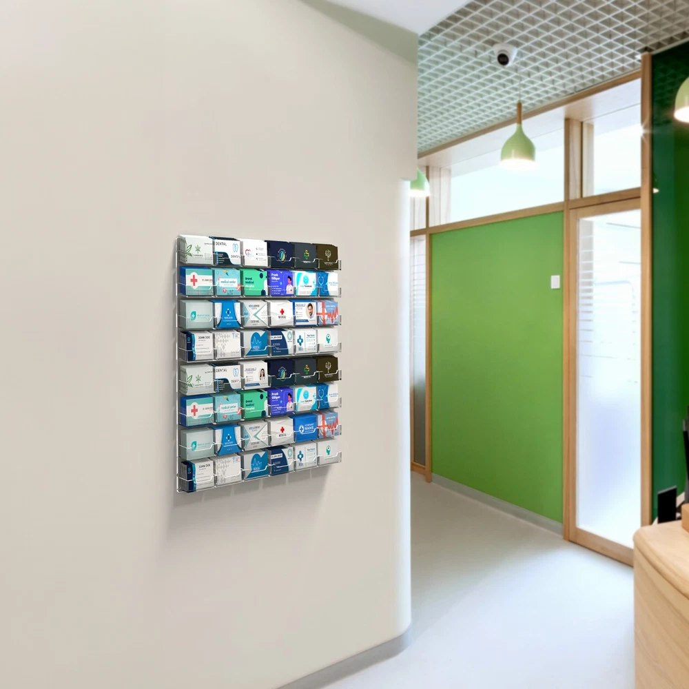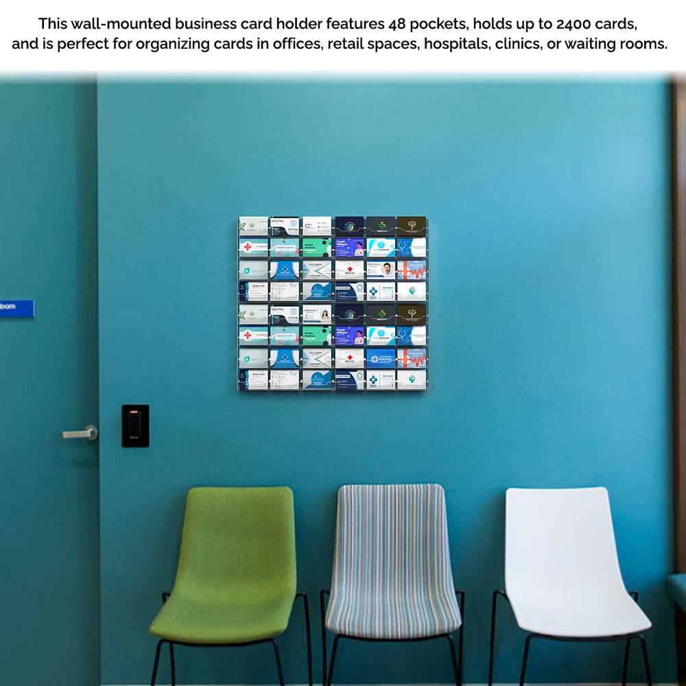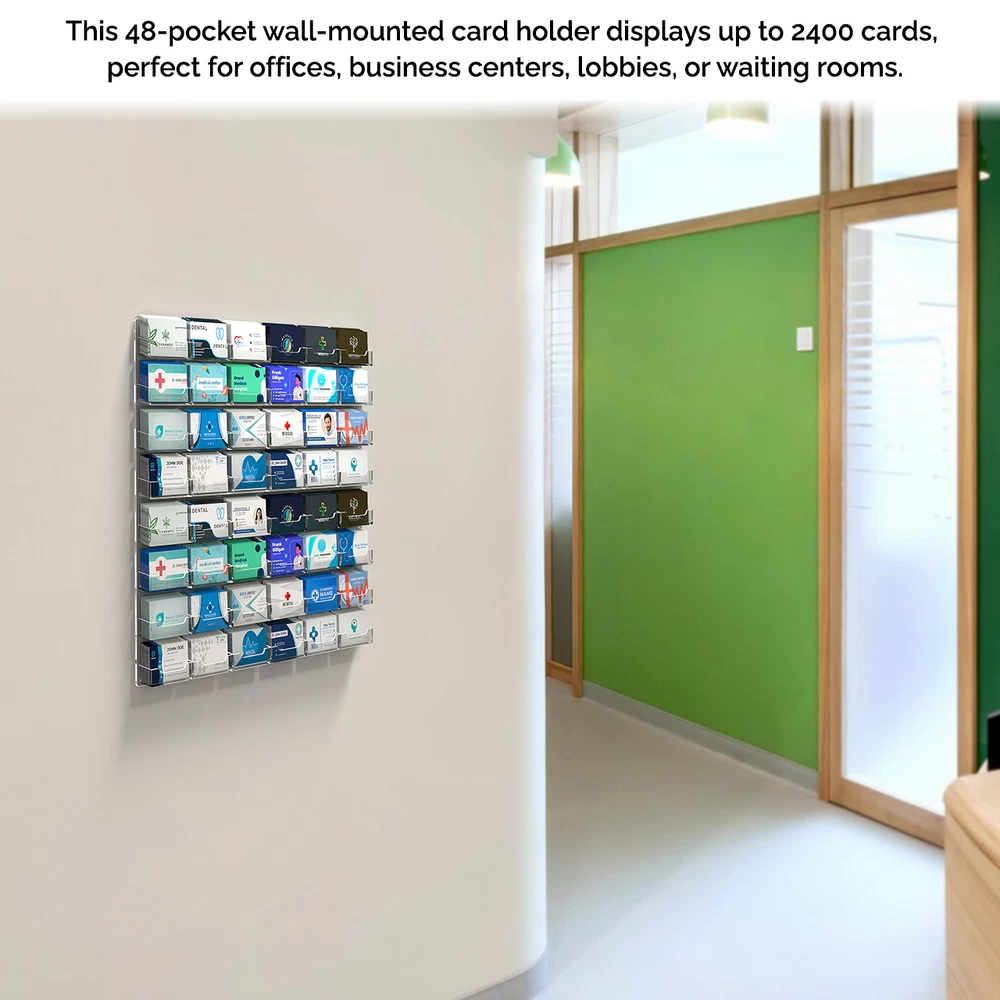 48 Pocket Gift Card Retail Holder Card Display Contact Wall Mount Product Features: Holds 3.5”W x 2”H standard sized business cards, appointment, membership, gift or rewards cards Pocket Dimensions: 3.5”W x 2"H x .75”D Overall Dimensions: 24”W x 21.5”H x 1'D Pocket Capacity: 50 standard business cards or 30 gift cards Holds up to 2400 business cards or 1500 gift cards Perfect space saving multi pocket wall mount display holder with pre drilled holes and hanging hardware This 48 pocket contact card rack is the perfect space saving choice for large office buildings or business centers. This thick polycarbonate wall mount business card holder provides a sturdy display for business, gift or appointment cards that complements any decor. These multi slot card racks are great space savers and help you keep counters free and clear of clutter! Looking for a convenient way to distribute multiple sets of cards in one convenient card organizer rack? Business card holders make spreading the word on the multiple sets of cards simple and easy to access and still appear professional. Just one holder to display multiple sets of printed material and help keep the clutter to a minimum. The appointment card display rack has a design that makes it easy for clients and potential customers to take one. Each pocket can hold up to 50 standard business cards so you will not have to fill them that often. This gift card showcase display is made with acrylic plastic material and made right here in the USA. The wall card rack provides long-term durability in addition to keeping your 3.5 inch by 2 inch printed material neatly in the holder, and can be easily placed on any wall by exits or entrances. We have designed these to display several sets of business cards and can be conveniently placed on walls or anywhere you want to leave your calling cards for the taking. These card holders come pre-drilled for easy hanging and includes hardware. All sizes are approximate Under no circumstances is Marketing Holders responsible for any actions involving hanging products using self purchased or provided hardware. It is up to the purchaser to make sure they are using the hanging hardware correctly. We will also not be responsible for the product if it cracks during the hanging process or if it falls and breaks. Return Policy 30 Day Return Policy: By purchasing our product you are agreeing to our return policy, so please read! Perfect returns (NO used merchandise) on stock items are accepted within 30 days of delivery. Any visual appearance that the product is used will result in 00 refund. All returns are subject to a 20% inspection, re-boxing and restocking fee. All returns must be repacked and returned in their original packaging for protection. (MUST return on pallet if received on Pallet) Packages being returned should be insured by you for your protection No credits are issued on shipping costs. Absolutely no returns accepted on custom order displays, including orders with custom text, imprinting or graphics