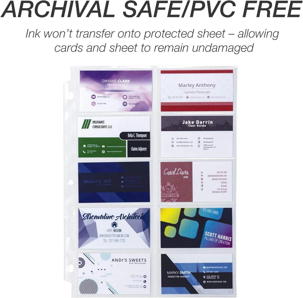 Business Card Holder Binder Pages Clear Sleeves Refill Organizer Book 25 pages CRYSTAL CLEAR VISIBILITY – Business card sheets have clear finish that provide optimum clarity for easy viewing SUPERIOR PROTECTION – 3.0 mil or .076mm thick polypropylene provides optimum performance and business card page is designed for durability and frequent daily use at home or office WON’T LIFT OR TRANSFER INK – PVC free, acid free, and archival safe business card holder sheets are made with non-stick material and will not lift copy from cards PROFESSIONAL LOOK AND FEEL – The clear view finish and heavy duty feel provide a premium product that is perfect for storing important contact information DURABLE SOLUTION – Clear insert sheets are made from polypropylene, a neutral material that’s stronger and more durable than vinyl Achieve superior protection for business cards with these heavyweight clear business card protector sheets. Available in a value pack of 25 clear insert sheets, these plastic sleeves help you protect individual business cards from dirt, debris, liquid and other contaminants while ensuring excellent readability to the materials inside. Each business card page is perfectly sized to hold 3.5” x 2” cards in any standard three-ring. Each double-sided page is designed to hold 20 cards (10 on each side) for added capacity. Samsill heavy duty clear business card pages are made of durable and high-quality PVC-free, non-stick polypropylene material that keeps your valued cards/contacts safe and organized in a busy work, home, or school environment. Not only they remain protected from spills, dirt and smudges, the clear polished finish also maintains a crisp and clear view of the content inside. The acid-free and archival safe polypropylene will not lift or transfer ink or photocopy in any way. Each heavy-duty card protector meets industry standards and measures 3 mil or .076mm thick to ensure superior performance and strength. The professional clear protective sheets feature side-loading orientation that allows quick adding or removing of cards. All the business card protector sheets feature three pre-punched holes at the edge to allow easy storage and organization. They can easily fit into any 3-ring binder. 0.25 inches x 8.25 inches x 11.25 inches. Weight: 0.01 oz Item model number 81090 Style Protection Color Clear Business Cards Material Polypropylene (PP) Material Type Polypropylene (PP) Manufacturer Part Number 81090 Item Weight 0.01 Ounces Is Discontinued By Manufacturer No Product Dimensions 8.25 x 0.25 x 11.25 inches Size 25 Pack