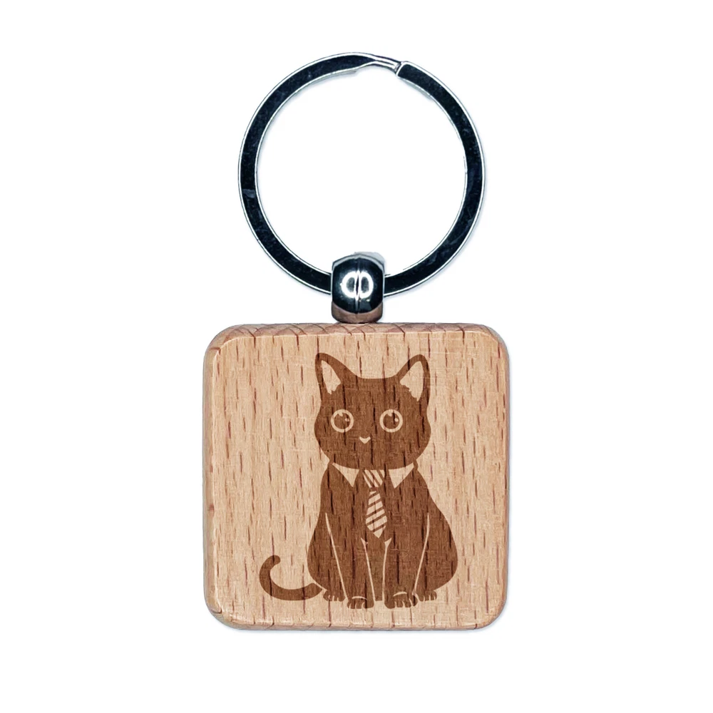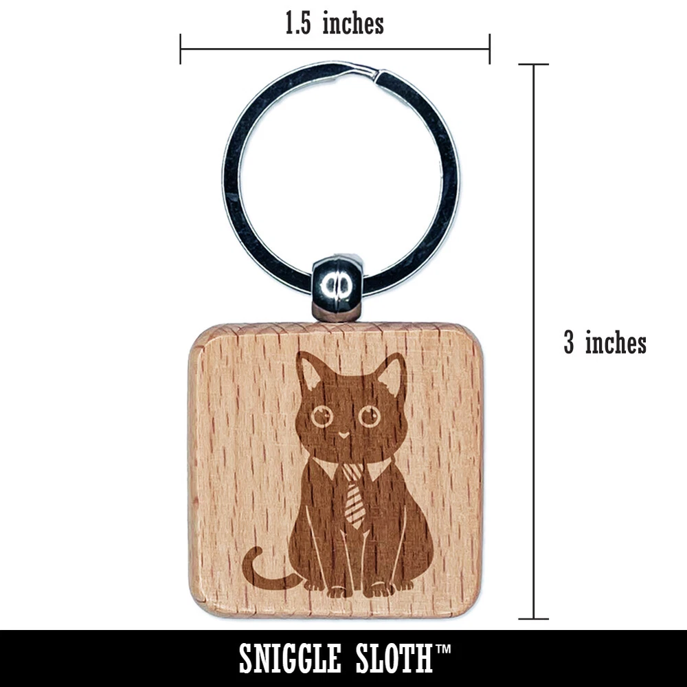 Business Cat with Tie Engraved Wood Square Keychain Tag Charm