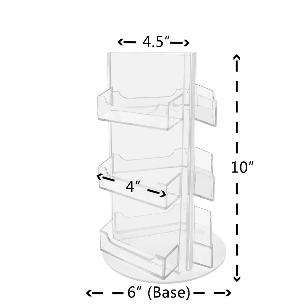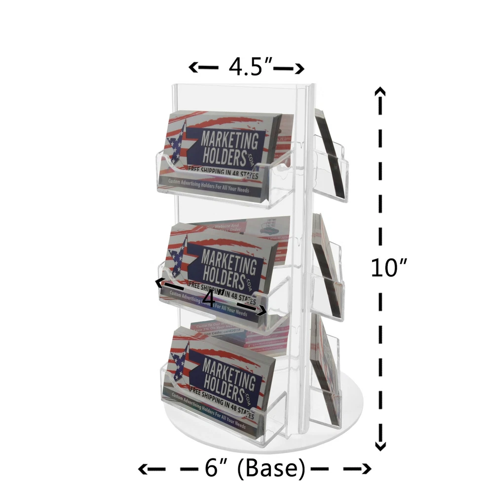 Business Card Holder 9 Pocket Rotating Countertop Display Spinner This nine pocket rotating business card holder provides an attractive desktop display for business cards or gift cards that complements any decor. Made of durable clear acrylic, the generous space between the card pockets provides full visibility of all nine sets of business cards access for card removal. Conveniently placed on desks, retail counters, tables or anywhere you want to leave your cards for the taking. Many retailers position an acrylic holder near the register, so customers can easily sign up for company cards or buy gift certificates. Advertising like this is one of the best ways to improve brand recognition and increase repeat purchases. This clear acrylic display stand is perfect for entrepreneurs who need to promote their business on numerous tables or counters to display your information in a clear and easily accessible manner, these are great for placement in restaurants, hotel reception areas, weddings, schools and other various venues such as Trade Shows, Flea Markets or Expos. In addition to business information, the clear acrylic holder can also be used to display other small media. Store credit cards or gift cards are often placed in the holder near the register or checkout stand to increase clientele and expand the customer base. Other times, simple gift certificates, and doctors appointment cards are placed in the pockets. Product Features : Perfect display solution for business cards and gift cards Space-saving design displays nine sets of cards in one convenient holder Freestanding and portable; display on desks, retail counters, or tables Angled, rotating design offers optimal view of cards Overall Dimensions: 4.5"w x 10"h with 6"W Base Pocket Dimensions: 3 11/16"w x 3/4"d Pocket Capacity Approx 50 Business Cards Premium High Quality Acrylic Return Policy 30 Day Return Policy: By purchasing our product you are agreeing to our return policy, so please read! Perfect returns (NO used merchandise) on stock items are accepted within 30 days of delivery. Any visual appearance that the product is used will result in 00 refund. All returns are subject to a 20% inspection, re-boxing and restocking fee. All returns must be repacked and returned in their original packaging for protection. (MUST return on pallet if received on Pallet) Packages being returned should be insured by you for your protection No credits are issued on shipping costs. Absolutely no returns accepted on custom order displays, including orders with custom text, imprinting or graphics