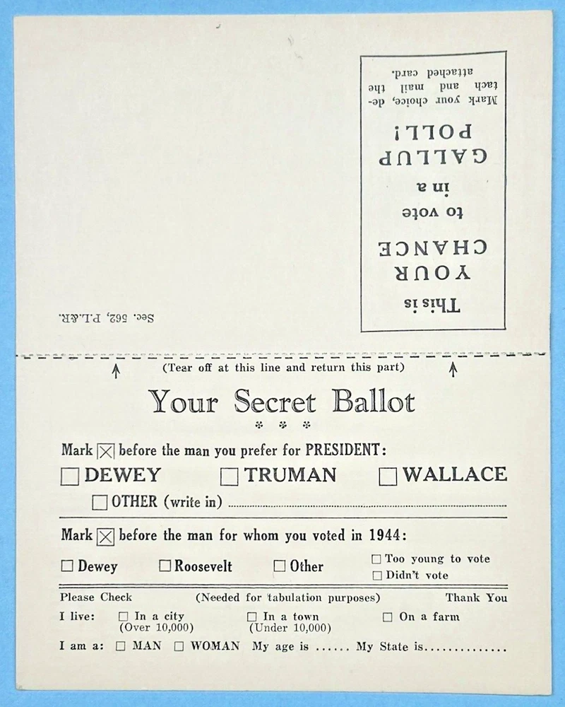 Business Reply Card Gallup Poll Secret Ballot Dewey Truman Wallace. Note: This item will be properly packed. We are also in the process of listing thousands of quality antiquarian and collectible books, ephemera and other quality items appealing to a wide variety of interests. Please visit our site often to view new additions. You will not be disappointed!