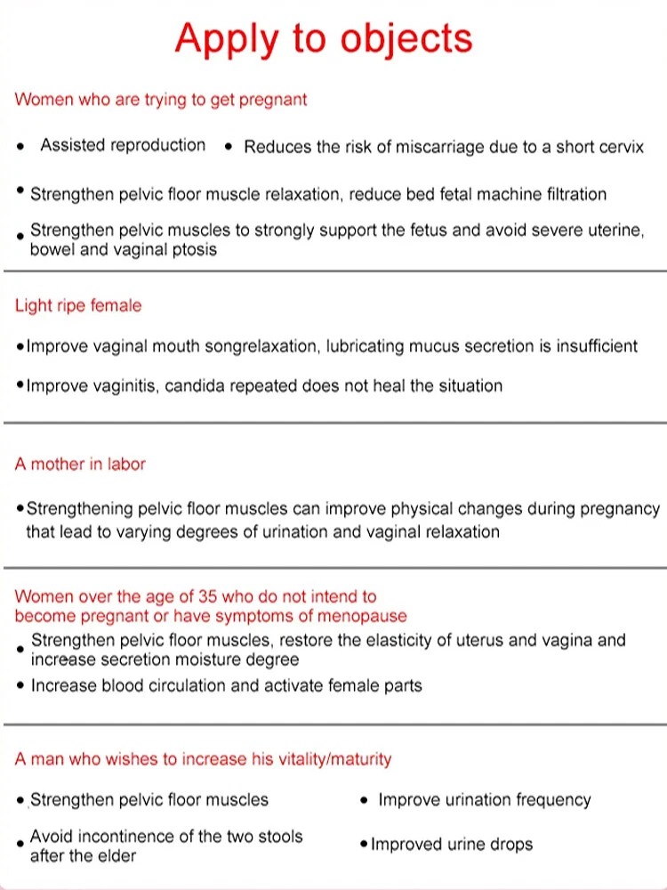 Why treatment is needed Pelvic floor muscle relaxation will cause pelvic floor dysfunction Mild obstacles: vaginal wall is loose, pudenda is dry, and you feel pain during sex; It is difficult to have orgasm; Decreased sexual pleasure, accompanied by tummy drop, frequent urination and constipation. Patients with aggravated condition: uterine prolapse, anterior and posterior vaginal wall bulge, urinary incontinence. Urinary incontinence seriously affects women's physical and mental health. Advantages 1. Strengthen pubococcygeal muscle (PC muscle) 2. Increase the blood flow and nerve function of the basin 3. Increase the thickness and lubrication of postmenopausal vaginal wall 4. Promote postpartum recovery 5. Restore vaginal muscle tension and improve vaginal health 6. Increased sensitivity and functionality 7. Prevention and treatment of stress urinary incontinence Package In clude : 1 * Main machine