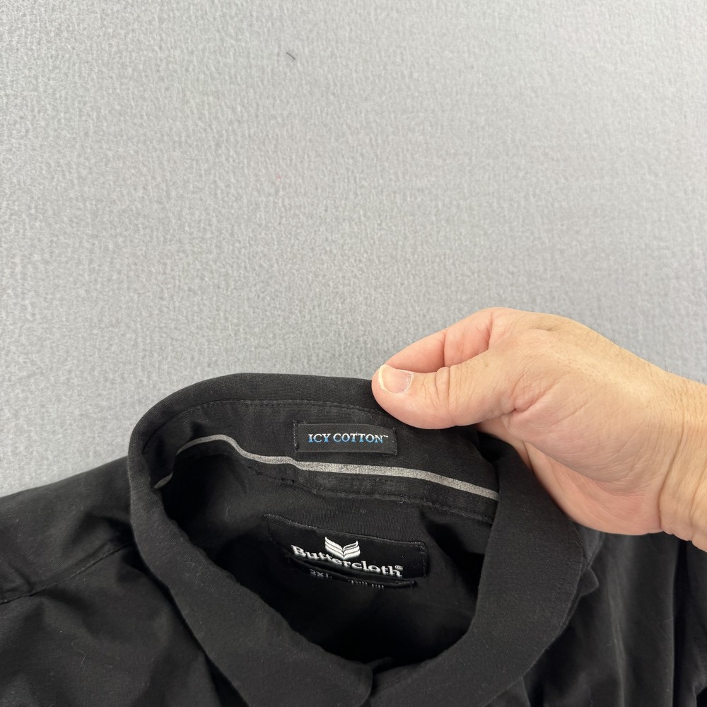 Buttercloth Shirt Mens 2XL Tall Black Icy Cotton Button Up Long Sleeve Dress Condition: Good used condition, some light wrinkling from storage, no visible stains or holes Tag size: 2XL Tall Fit Color: Black Brand: Buttercloth Button up front closure with black tonal buttons Collared neck style Long sleeves with double button cuffs Icy Cotton technology for enhanced cooling comfort Back yoke for added mobility and tailored fit Buttercloth logo on inner neck label Material: Not specified (typically a blend known for softness and stretch; see Buttercloth's standard materials) Pit to pit measures approx. 25.5 inches; back length from collar seam approx. 34.5 inches (see photos for measurements)