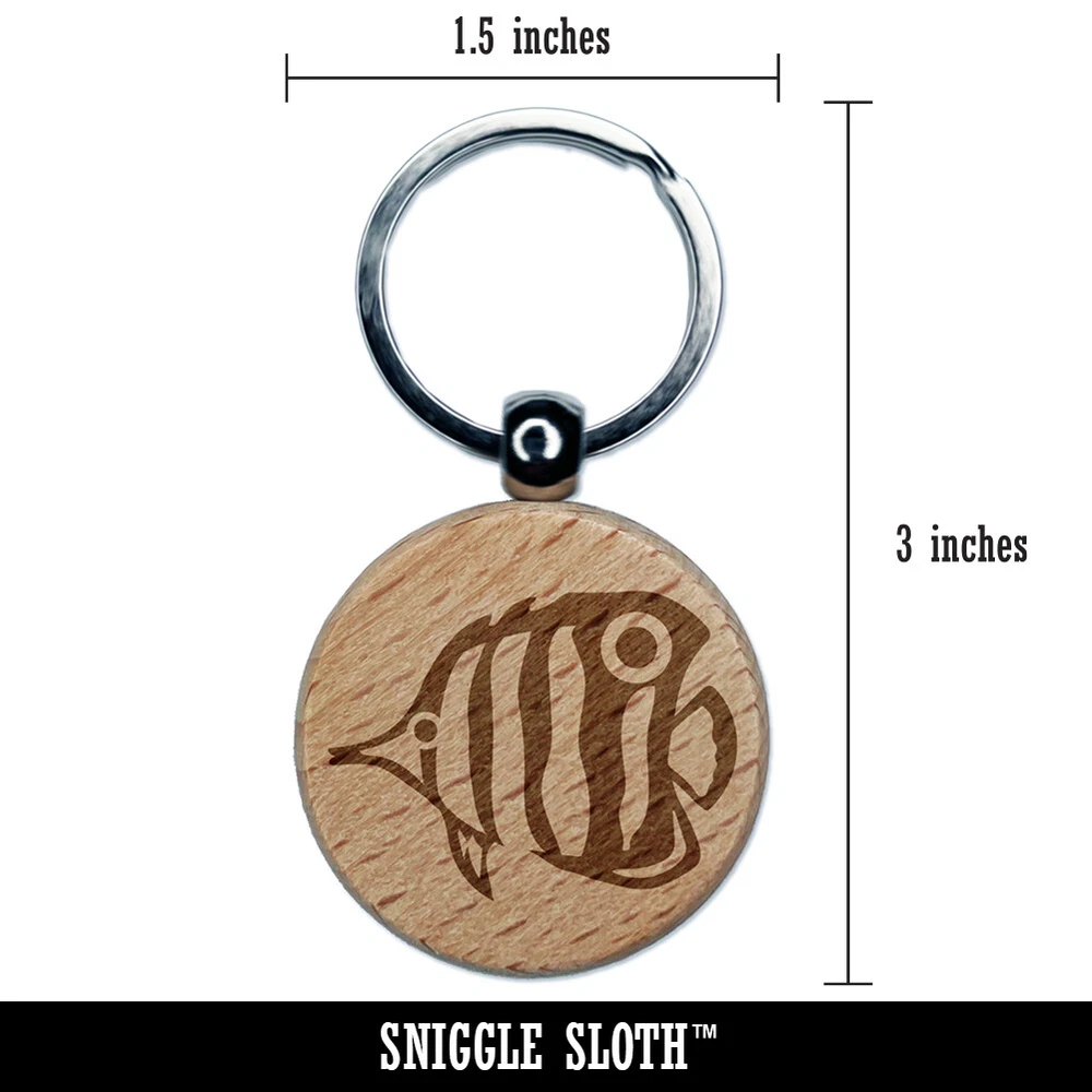 Butterfly Fish Engraved Wood Round Keychain Tag Charm