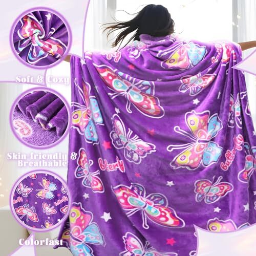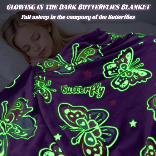 Glow In The Dark Blanket Butterfly Blanket Girls Blanket Girls Gift BIRTHDAY GIFTS FOR GIRLS-it can be a surprise gifts for girls who love butterflies.the glow in the dark cute stuff blanket can light up at night which can inspire funny ideas for kids to enjoy the magical glow.it can be a butterfly gifts ,girls gifts for birthday, halloween, christmas,easter, thanksgiving,mothers day or any other party.it's also can be Girl Toys Butterfly Blankets for all age,a choice for girl birthday gifts,little girl gifts,presents for girls,gifts for girls 4 5 6 7 8 9 10. GLOW IN THE DARK BLANKET-make your child's nights magical with our plush light up blanket.our butterfly throw blanket is mysterious and interesting.it can shine in the dark.just place it under a bright light source or sunlight for about 15 to 20 minutes.you will see many butterflies shining in the dark.the brighter the light,the stronger the blanket will be in the dark.create a magic atmosphere for your bedroom and watch the magic happen. BUTTERFLY BLANKET FOR KIDS-glow in the dark butterfly blanket are made of soft,silky microfiber material that breathable and warmth.the unique design of butterfly pattern blanket is that it glows in the dark.this warm blanket are long-lasting,resistant to shrinkage and wrinkling, and retain their shape over time. SOFT COZY BLANKET- glow in the dark kids blanket is made of skin-friendly material,unique design of the blanket is that it can glow in the dark.the unique design provides you with a different sense of softness,you will feel warmth and comfort in the bed.whether it's a cozy night on the couch, sleeping in the room, or traveling in the car, this lightweight warm blanket can use for all seasons and ages.If you want a blanket that can be used all year round, this would be a good choice. CUTE BLANKET FOR TEENS-this fleece blanket uses new luminous technology, comfortable fabrics and cute patterns. these unique designs make this blanket not only look cute, but also decorative. our luminous blanket has many patterns and styles for you to choose from, and we hope you can choose your favorite pattern.when you're done cleaning this adorable blanket, we recommend machine washing it separately on the gentle cycle in cold water and tumble drying on very low.