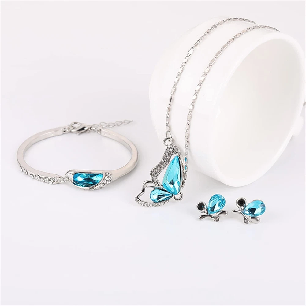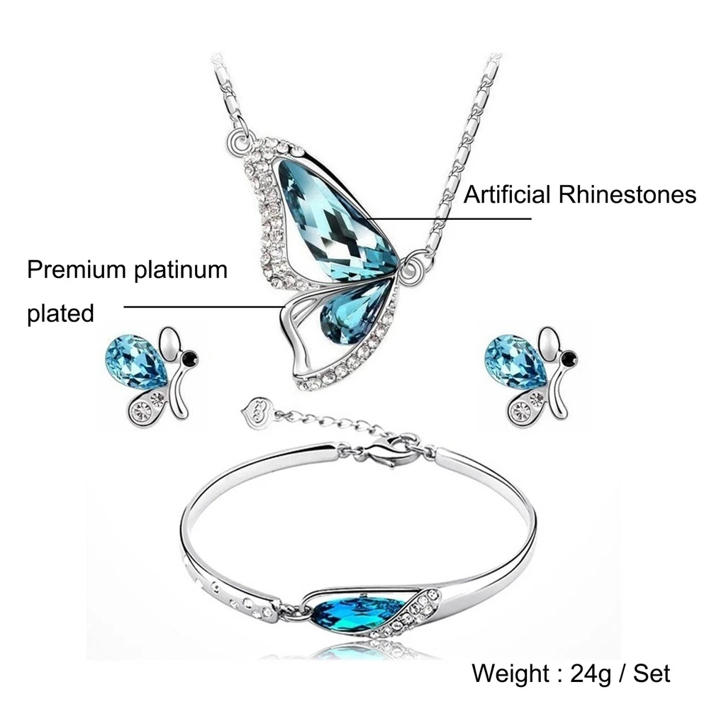 Butterfly Jewelry Set, Rhinestone Crystal blue Butterflies Necklace/Earrings/Bracelet Gifts Women's Wedding Bridal Necklace Dangle Earrings Set Statement Anniversary Jewellery Product Details Color: Blue Brand: Gilieyer MPN: MAGS1001001R UPC: 751717433529 EAN: 0751717433529 Department : womens Date First Available : March 17, 2022 Brand, Seller, or Collection Name: Gilieyer Metal: platinum-plated-base Material: non-precious metal Gem Type: Rhinestone Clasp: Lobster Clasp Number of stones: 3 Model number: GS1001001R