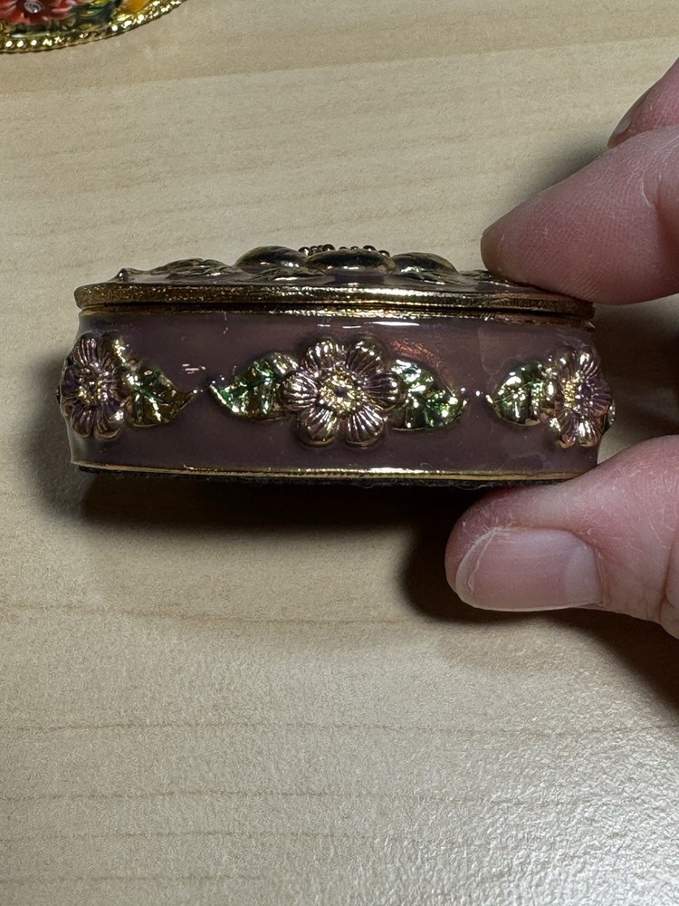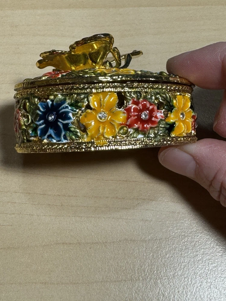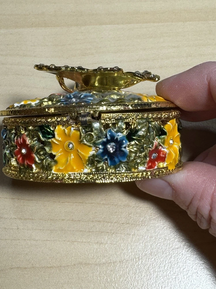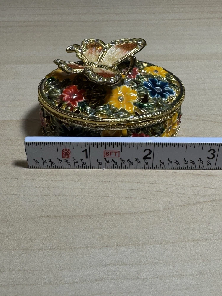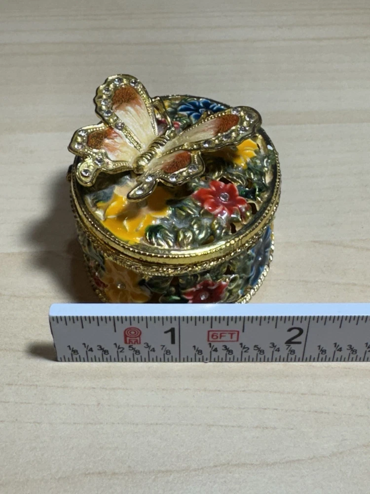 The product is a set of two mini trinket boxes in the shape of butterflies, adorned with rhinestones and floral enameled details in a gold color. These boxes are perfect for all occasions and are made of metal. The traditional style boxes feature a magnetic closure and are part of the Keepsake Boxes collection, adding a touch of elegance to any space. Each box measures 2.5 inches in length and is beautifully crafted in the United States, making them a unique and charming addition to any collection.
