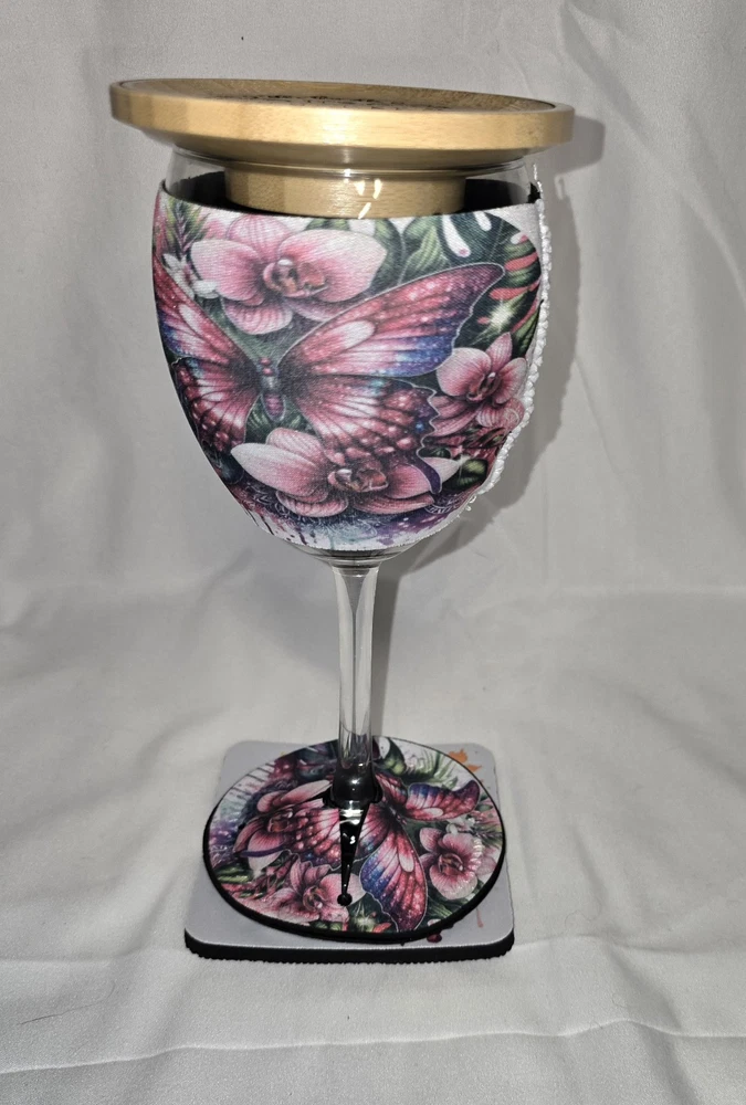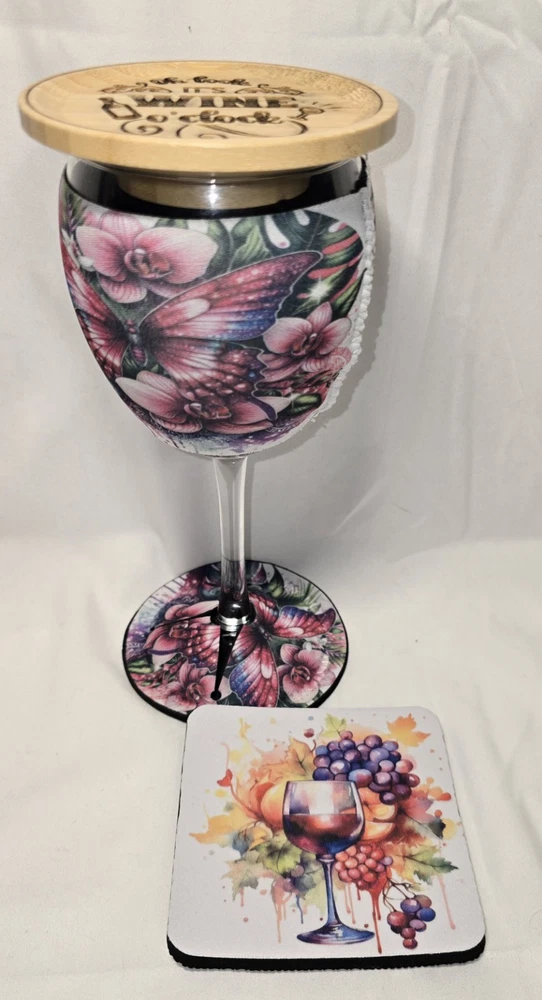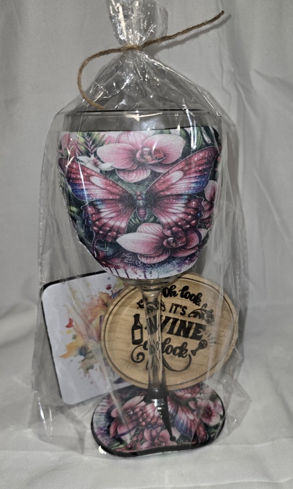 Care Instructions: Hand Wash Only Material: Glass, Wood, neoprene Brand: Handmade Character: butterfly Style: Modern Character Family: butterflies Department: Adults Number of Items in Set: Four-Piece Set Includes: Red Wine Glass, charcuterie board, coaster, wine koozie Capacity: 8 oz Glassware Type: Wine Glass Country/Region of Manufacture: United States Features: Dishwasher Safe, Engraved Shape: Round Type: Wine Glass Service For: 1 Theme: Butterflies MPN: 1 Personalize: No Occasion: Easter, All Occasions, Anniversary, Bachelorette Party Pattern: butterfly Color: Multicolor
