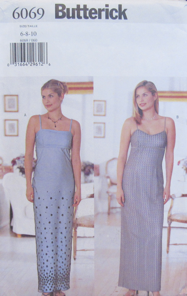 Butterick 6069 Misses S6-8-10 Evening Gown Sexy Slim Empire Slip Dress Pattern Butterick 6069 Misses S6-8-10 Evening Gown Sexy Slim Empire Slip Dress Pattern Butterick Sewing Pattern 6069, dated 1999 Women's Slim, Lined Evening Gown with Two Bodice Options Misses Sizes 6--8--10 are ALL included fits busts 30½--31½--32½" UNCUT, factory folded, new & unused condition Envelope has some faint sticker residue on front, otherwise very good ~I mail All patterns in an archival quality storage sleeve. ~I ship SAME or NEXT business day . . . always! ~I don't use tracking for patterns. They are shipping USPS Flat 1st Envelope. ~I personally guarantee delivery within 10 business days or you money back! Listing and template services provided by inkFrog