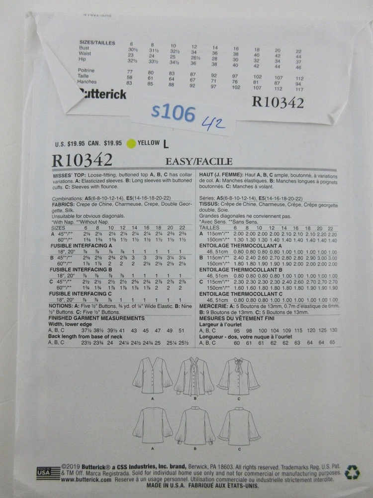 Butterick Pattern Women Loose-fit Button Front Tops Blouse B6710/B10342 Sz 14-22 New, uncut pattern ready for your next project!