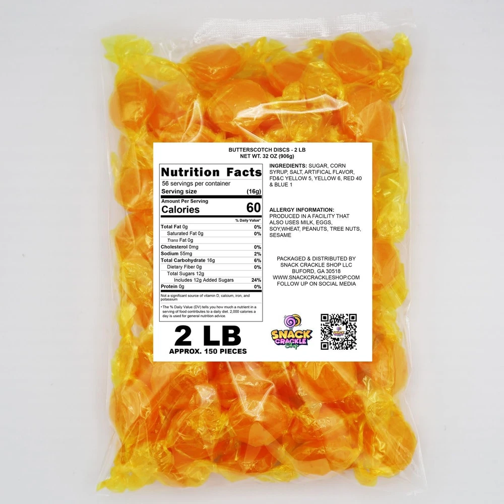 Treat yourself to the rich, buttery flavor of these butterscotch discs! Each individually wrapped piece delivers a smooth, melt-in-your-mouth sweetness that’s perfect for any occasion. Whether you're filling up candy dishes, creating party favors, or just satisfying a sweet tooth, these butterscotch candies offer a delightful, timeless treat. Packed in a generous bulk bag, they’re perfect for sharing with friends, family, or guests. Their classic taste and long-lasting flavor make them a crowd favorite that never goes out of style! Classic Butterscotch Flavor: Enjoy the rich, buttery sweetness of traditional butterscotch in every disc. Individually Wrapped: Each candy is individually wrapped to maintain freshness and make sharing easy. Bulk Size: Large bag ideal for stocking up, filling candy dishes, or handing out at parties and events. Bulk Size: Large bag ideal for stocking up, filling candy dishes, or handing out at parties and events. Long-Lasting Treat: These hard candies provide a smooth, slow-melting flavor that lasts, making them perfect for savoring.
