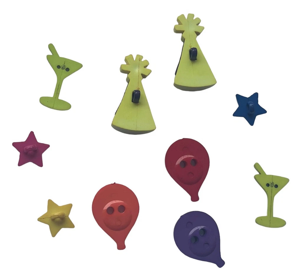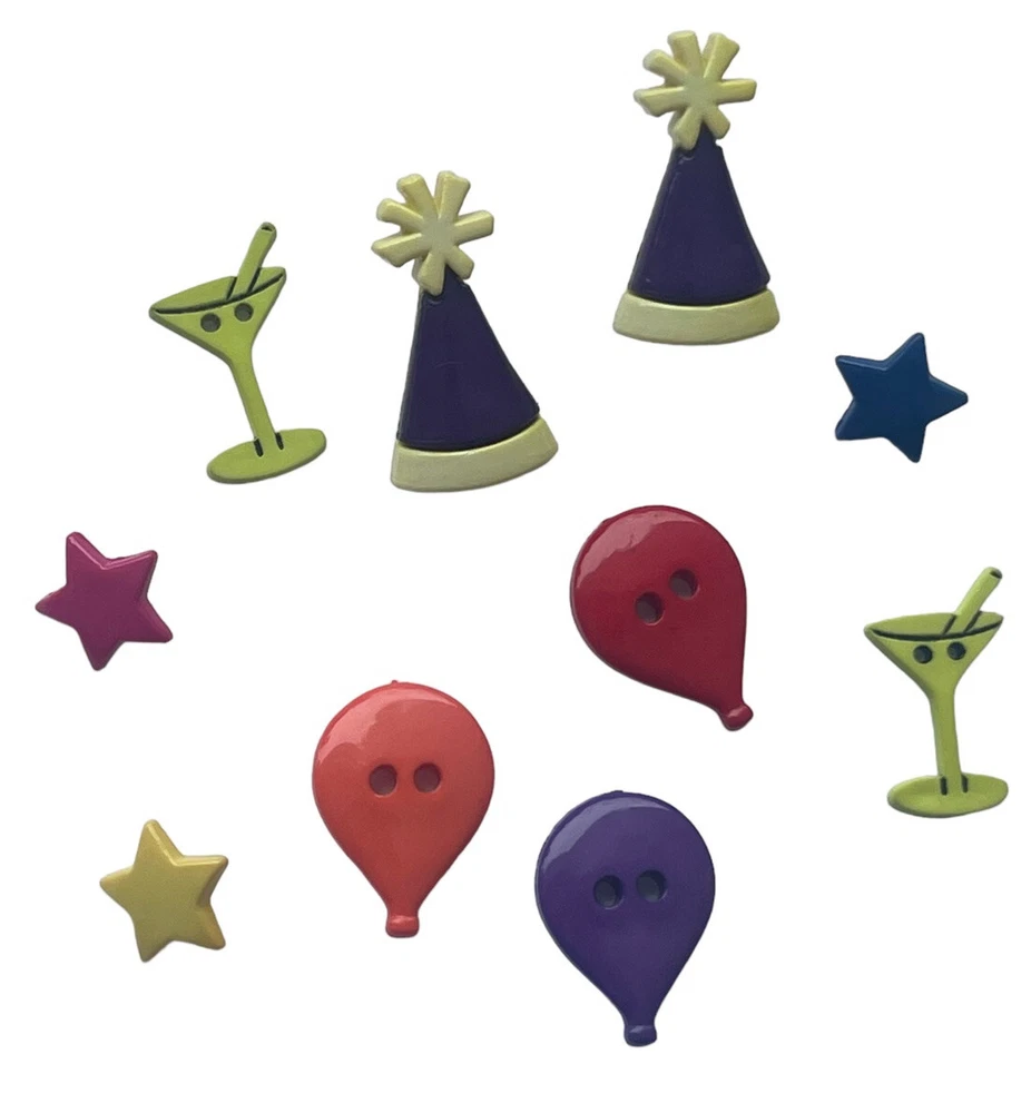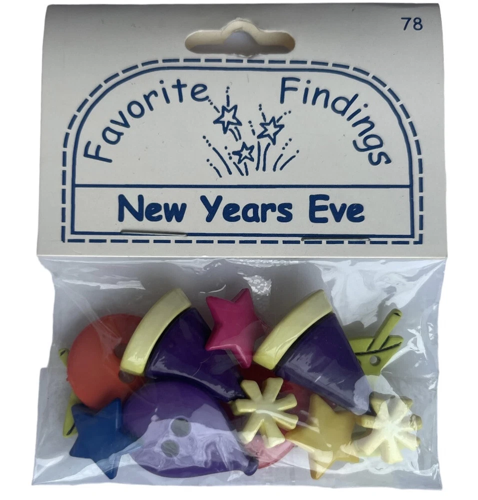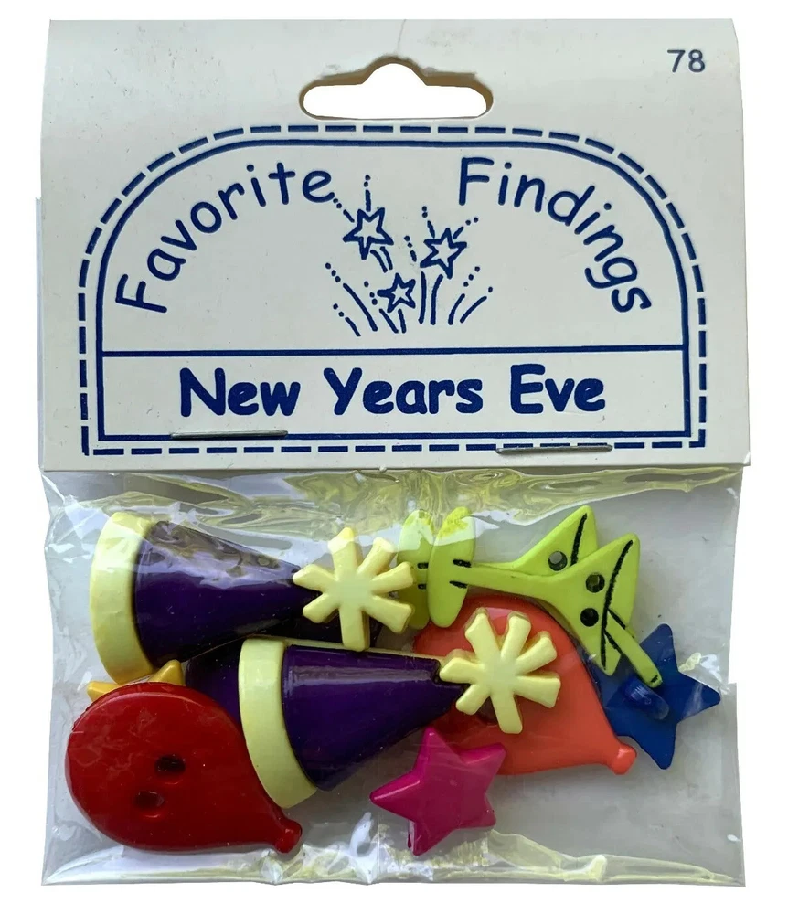 New Favorite Findings Blumenthal Lansing "New Years Eve" shank buttons and others in an assorted pack including palm trees, cruise ship, camera, photo album, ticket, credit card . Packaged in the USA of pieces from the USA, Thailiand, Taiwan, China & Korea. Glue on, sew on, or attach.
