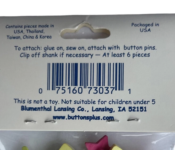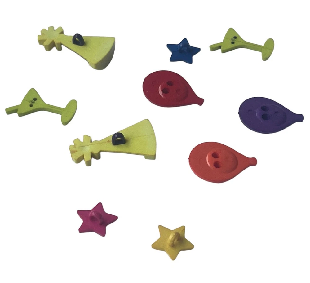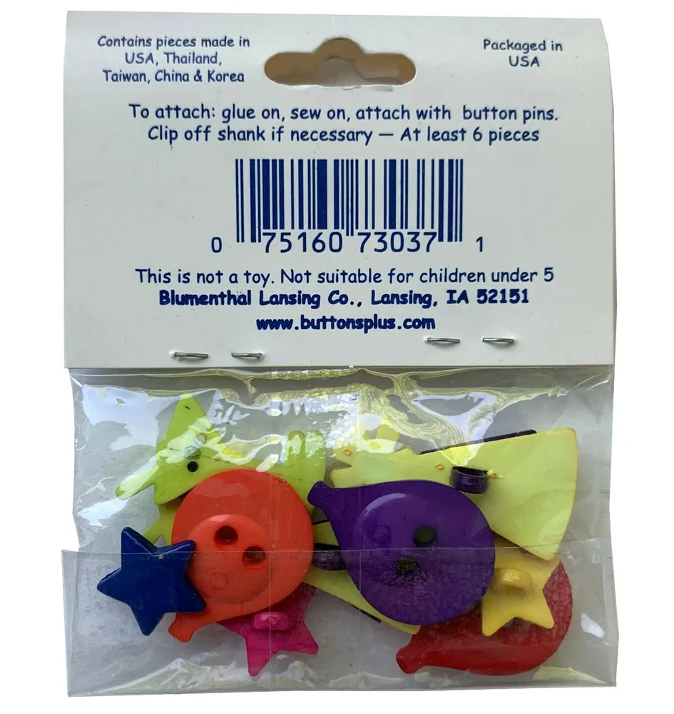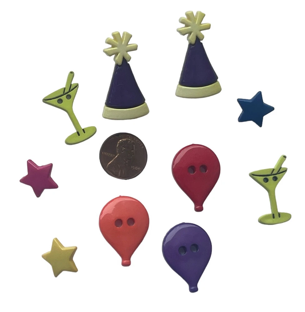 New Favorite Findings Blumenthal Lansing "New Years Eve" shank buttons and others in an assorted pack including palm trees, cruise ship, camera, photo album, ticket, credit card . Packaged in the USA of pieces from the USA, Thailiand, Taiwan, China & Korea. Glue on, sew on, or attach.