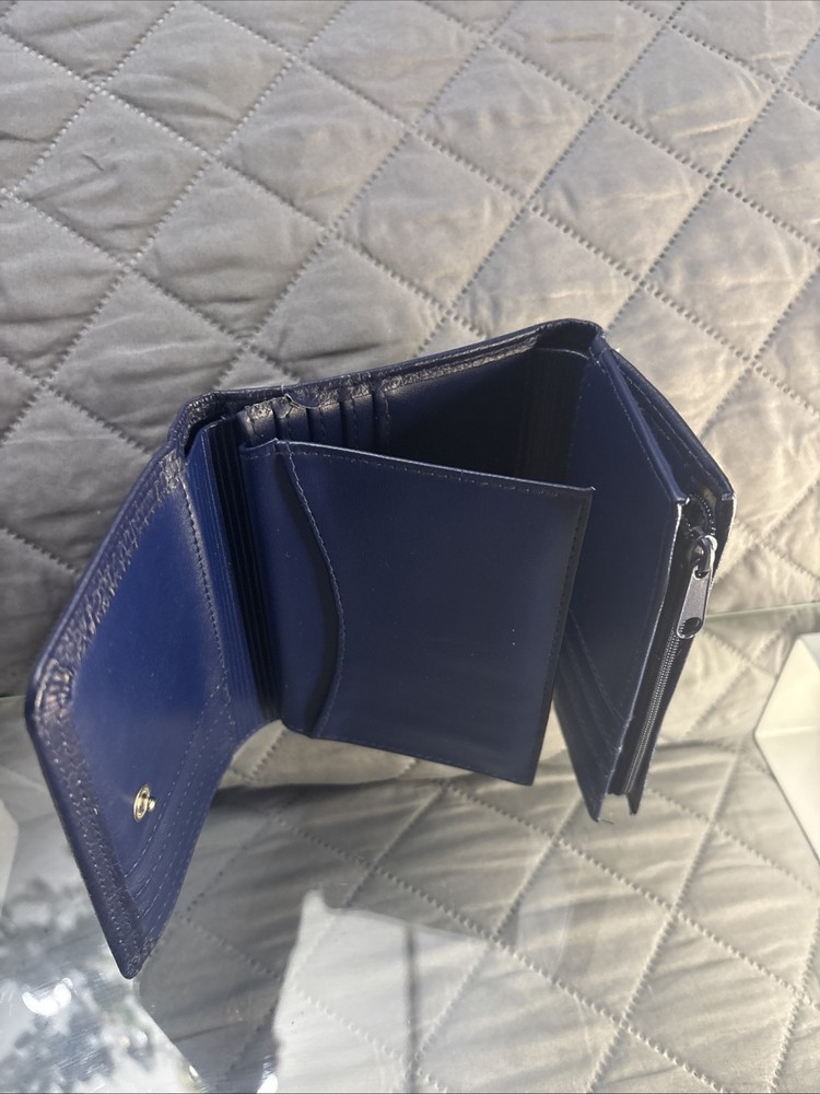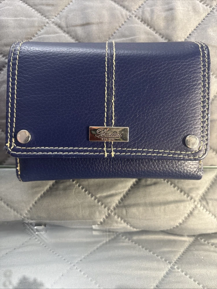 This Buxton women's navy wallet is a stylish and practical accessory made of genuine leather. With its trifold design, it easily fits in your handbag and is perfect for organizing your credit cards and cash. The wallet features beautiful accents such as rivets, stitching, and the Buxton logo, giving it a designer look. Measuring 5.25" in length and 4.25" in width, this wallet is compact and lightweight, making it ideal for everyday use. It has a unit quantity of 1 and weighs oz. The wallet comes in a blue color and has a theme of money, wallet, and logo. Its features include credit card and folding, making it a convenient choice for those who want to keep their essentials close at hand.