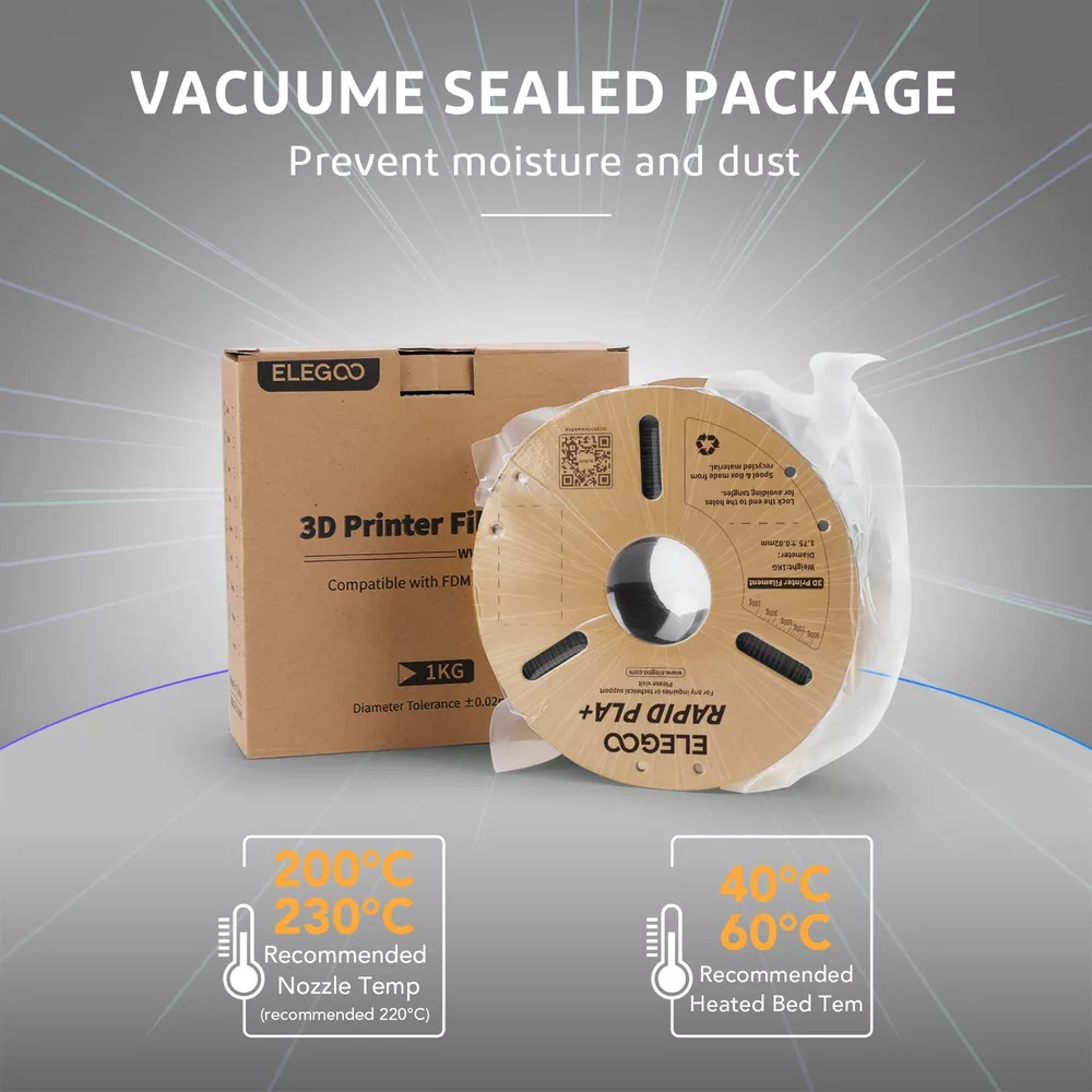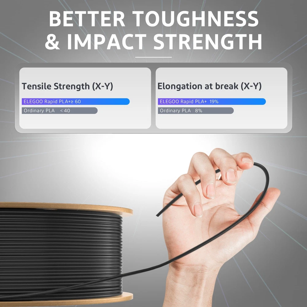 【30-600mm/s Printing Speed】With enhanced fluidity, ELEGOO RAPID PLA+ filament melts rapidly and flows smoothly, allowing for up to 600mm/s fast printing speed. You can complete the projects quickly without compromising on quality. 【Enhanced Strength & Toughness】ELEGOO RAPID PLA plus filament features high flexural modulus and elongation at break, which makes it resistant to brittleness and cracking, bringing excellent results for printing functional parts. 【Less-tangle & Neatly Wound】Full mechanical winding and strict manual inspection ensures that all high-speed pla plus filaments are neatly wound, which effectively reduces tangles, snap and line breakage issues. 【Top-Notch Accuracy & Consistent】Precise production process guarantee the filament of 1.75mm diameter, accuracy of +/- 0.02mm. PAPID PLA+ FILAMENT Specially Design for High Speed 3D Printing 【Less-tangle & Neatly Wound】 Full mechanical winding and strict manual inspection ensures that all high-speed pla plus filaments are neatly wound, which effectively reduces tangles, snap and line breakage issues 【30-600mm/s Printing Speed】 With enhanced fluidity, ELEGOO Official Store UK RAPID PLA+ filament melts rapidly and flows smoothly, allowing for up to 600mm/s fast printing speed. You can complete the projects quickly without compromising on quality 【Enhanced Strength & Toughness】 ELEGOO Official Store UK RAPID PLA plus filament features high flexural modulus and elongation at break, which makes it resistant to brittleness and cracking, bringing excellent results for printing functional parts 【Top-Notch Accuracy & Consistent】 Precise production process guarantee the filament of 1.75mm diameter, accuracy of +/- 0.02mm. Strict tolerances and perfect dimensional accuracy ensure smooth and consistent feeding for filaments 【For Most 3D Printers】 Rapid PLA+ filament fit for both regular printers and high speed printers, perfectly for most high speed printer such as Neptune 4, Neptune 4 pro, K1, K1 Max, Ender 5 series, Kobra 2, M5, M5C and more Technical Specifications Density: 1.20g/Cm³ Melt Index: 8.2(190°C/2.16kg)g/10min Tensile Strength(X-Y): ≥ 60mpa Elongation At Break(X-Y): 19% Bending Strength: 80mpa Bending Modulus: 2680mpa Charpy Impact Strength: 3.85kj/M² Thermal Deformation Temp: 53°C(0.45mpa) Fan: 100% Line Length: (1.75mm) 330-335m Rockwell Hardness: 88 Print Layer Thickness: 0.2mm Recommended Extrusion/Nozzle Temp: 200~230°C(Recommended 205°C) Recommended Heated Bed Temp: 40-60°C Printing Speed: 30-600mm/S Recommendation Platform: PEI/Glass/Fiberglass Board+Pvp Glue Stick Or Textured Paper
