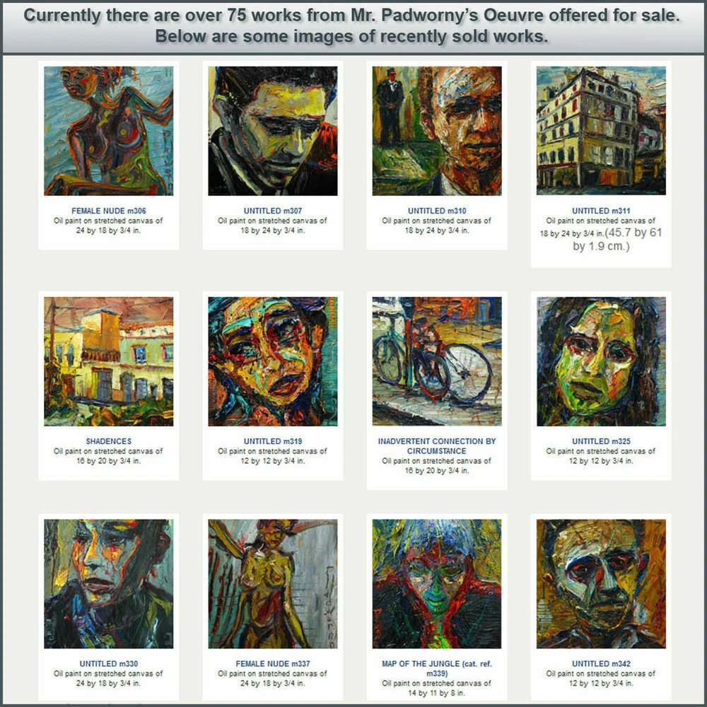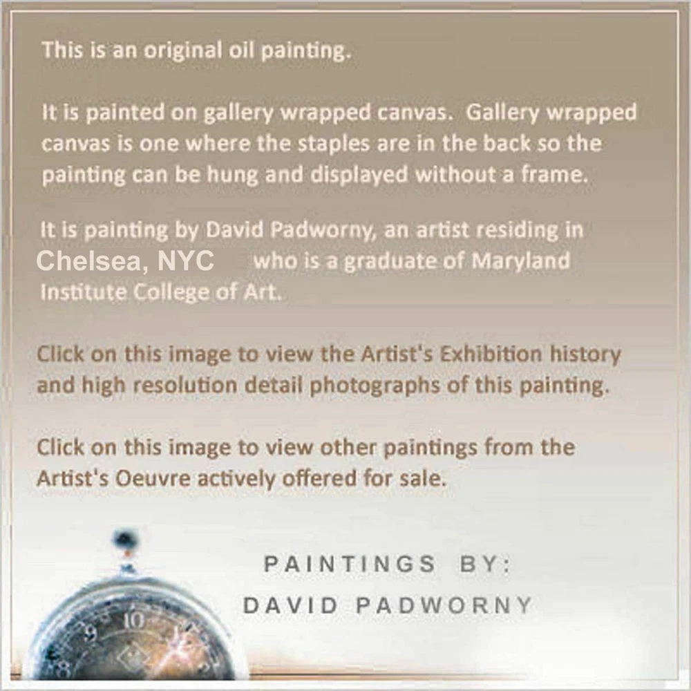 https://www.linkedin.com/in/padworny x7 Title: UNTITLED x7 Oil Paint on Gallery Wrapped Stretched Canvas Has paint drips on the bottom of the canvas, see images below 20 by 16 by 3/4 in. (50.8 cm by 40.6 by 1.9 cm.) [Please allow me a few days to package and ship these oil paintings -- thank you!] signed on front and back Note: I am very happy to entertain all offers on paintings. Every offer received is always considered a compliment. - DP Note: I am very happy to entertain all offers on paintings. Every offer received is always considered a compliment. - DP S C R O L L D O W N T O V I E W M O R E D E T A I L I M A G E S To sign up for the weekly newsletter of new auctions and paintings in the eBay store CLICK HERE Title and Provenance This painting is entitled UNTITLED x7 , and includes the original signature of artist on front of painting and verso, with painting catalogue series and number applied on verso. Painting also includes a Certificate of Authenticity documenting chain of title and provenance for this work. Painting number x7 may be included in forthcoming Catalogue Raisonné of the works of DAVID PADW0RNY. Medium and Dimensions Oil Paint on canvas of 20 by 16 by 3/4 in. , including hanging clip. This painting is pre-stretched and sides of the canvas are painted (see images below). Each of the sides are painted differently, to read more about why each is painted in a unique manner please click here . The staples holding the canvas to the stretcher bars are on the back so the painting is ready for immediate display. Shipping notes: We are pleased to combine shipping. If you intend to buy/bid on additional works, please send email to let us know your preferences. If you would prefer overnight or expedited shipping we will be happy to accommodate your wishes - please email for a specific bid. If you wish to combine shipping -- please request that the future invoices be changed to reflect combined shipping. For more details on combined shipping please visit these links based on your location: United States , Canada , all other International . Payment: PayPal is preferred. Paintings will ship upon bank clearing your funds. Please make payment within 5 days of sale. If there are special circumstances that might prevent this -- please email prior to sale. Thank you. Guarantee: If for any reason the actual painting does not meet your full expectations, please return it upon receiving it in its original condition and packaging materials. We will refund the full cost of the painting, less shipping costs. Additional Images and Materials (All links below will open in a new window) To sign up for the weekly newsletter of new auctions and paintings in the eBay store CLICK HERE About The Artist DAVID PADW0RNY was born in Norristown Pennsylvania. He is a graduate of the Maryland Institute College of Art and is currently working full time as a professional artist in Chelsea, NYC. Awards and Honors Scholastics Portfolio Award, New York, New York Ed Lindgren Memorial Scholarship, Sponsored by Artworks Orlando Orlando, Florida Fanny B. Thalheimer Scholarship, Maryland Institute College of Art Baltimore, Maryland First Place and Honorable Mention in Painting, Maitland Arts Festival Maitland, Florida Best of Show and First Place, "Enjoying Our Lakes" Photography Contest Windermere, Florida Three Gold Medals, Scholastics Competition, University of Central Florida Orlando, Florida Additional Paintings Offered other ebay auctions (opens in a new window) Collector Comments Please feel free to email your opinions and comments of the paintings. We look forward to hearing more from you, our Valued Collectors, Gallerists and Curators. -- D.P.
