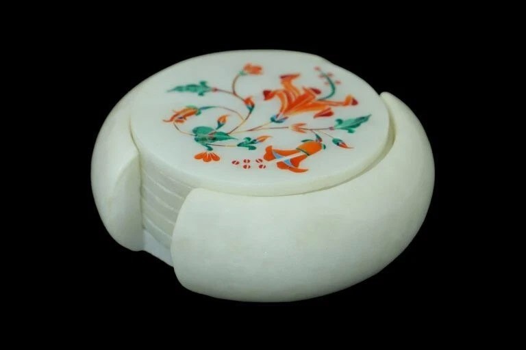 Product information Coaster Holder Size: 4"x4" Inches Coaster Plates Size: 3.5"x3.5" inches Material: Marble & Semi Precious Inlay Stone Shape: Round Finished- Polished Process of Making Marble Inlay We are inlaying semiprecious stones in three different colors of marble White Marble,Black Marble & green marble. The Marble used to inlay the semiprecious stone comes from city of Makrana, Rajasthan India. First we cut the marble in different shape example Round,Octagonal,rectangle,oval & square shape. After cutting the marble we paint the surface of marble with Hina(red Color) so we can sketch the geometry on the surface of Marble. With the Help Of emery wheel we cut,polish & shape the semiprecious in different forms of flowers,buds,leafs & stems all the cutting of the semiprecious stones are manually cut by the artisans. After cutting the semiprecious stones we assemble them to complete the motif & then the semiprecious stones are placed on the surface of marble so we can trace them on the surface of marble to make the exact size of the cavities once the stones are traced we remove the stones from the surface of marble & then manually we chisels the marble with the diamond chisels & tungsten carbide chisels once the cavities are completed we place the semiprecious stone in the cavities to check the depth of the stones. When we are fully sure that the stone fits well in the cavities we use special kind glue to fix the semiprecious stones into the marble. After completing the inlays into the marble we first rub the surface of marble with sandstone & then we polish the surface of marble with sandpaper which brings the natural shine on the surface of marble & to the semiprecious stone & we use wax polish to make the surface shiny. Most interesting expect of this pietre dure( marble inlay with hard stone) all the designs are made by the artisans are purely an imagination of artist once made they cannot make another one exactly the same it will look similar but will not be the same. This beautiful art is a dying art of Agra,India the artisans those make this beautiful art are the descendants of those families who built the Tajmahal in 17 century Tajmahal is a monument of love & you can easily see the artwork done with the same technique on the walls of the Tajmahal. I Invite you to come to Agra,India & visit the beautiful Tajmahal & you will surely be impressed & we request you give us a chance to show you the true handmade art of Agra by our artisans. When you are purchasing this beautiful handmade Marble inlay art you will always be happy because all the pcs made by our artisans with love,hope & happiness. You will always be enjoying the beautiful handmade marble inlay artwork secondly you will be supporting the local artisans of Agra,India to keep this beautiful dying art Alive. All the purchase benefits the artisans & the buyer as there is no middle men in selling & buying. USE OF THE PRODUCT It is beautiful for Kitchen & Home decorative handmade Inlay Art add Royal Ambiance to your Home. You can use this as a Hotel, villa, home use & interior decorations,Wedding Occasion & Corporate Gifts. Note We welcome your personalization request (custom request) as per your size, shape and design but you have to pay spare money. Buyers are liable for any customs and import taxes that may apply. I'm not liable for delays due to customs. Marble inlay handicrafts & other natural marble products are handmade products, colors of semiprecious stones & marble used may slightly vary from the image shown. Equipment & accessories are used only for photography purpose which do not ship with the product. We are unable to ship to a PO Box address & for Russia, Brazil country we need firm entity name or business name parcel will not go to individuals name. If you have any query please feel free to contact us. Shipping & Packaging For shipping we use DHL & FedEx Export packing sealed wooden, crate with foam plastic straps outside. If there is any Local Tax, Custom Duties or Vat at the destination, it will be paid by the buyer Inspiration/Story Behind This Product This beautiful art is a dying art of Agra,India the artisans those make this beautiful art are the descendants of those families who built the Tajmahal in 17 century Tajmahal is a monument of love & and one of the seven wonders in the world you can easily see the artwork done with the same technique on the walls of the Tajmahal. Wish you a very happy day & Happy shopping