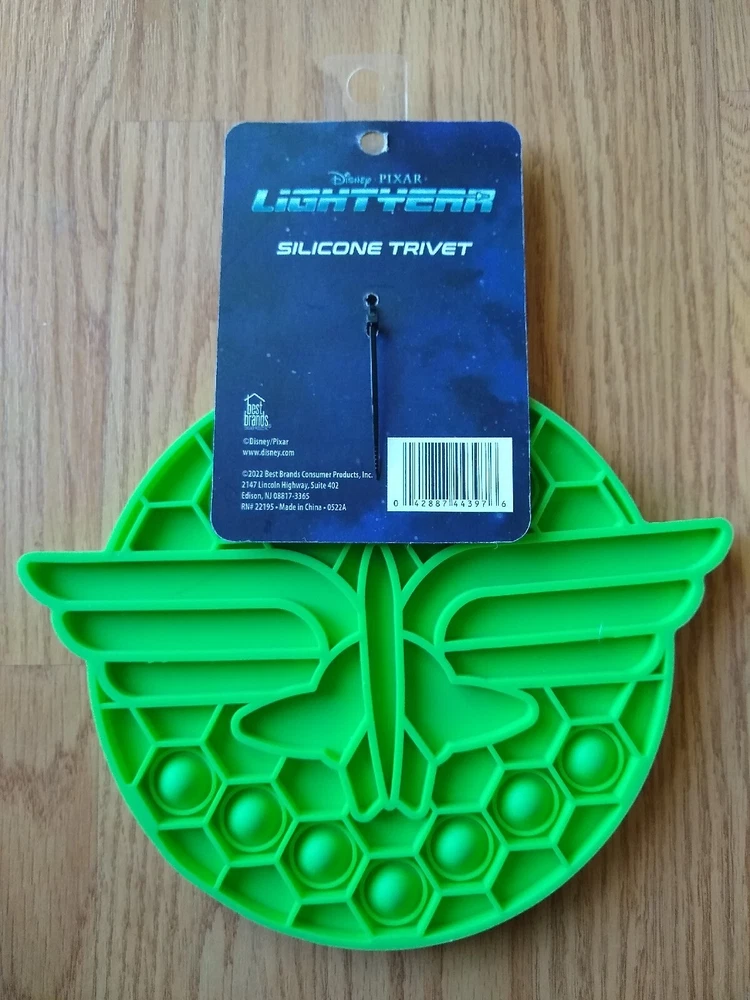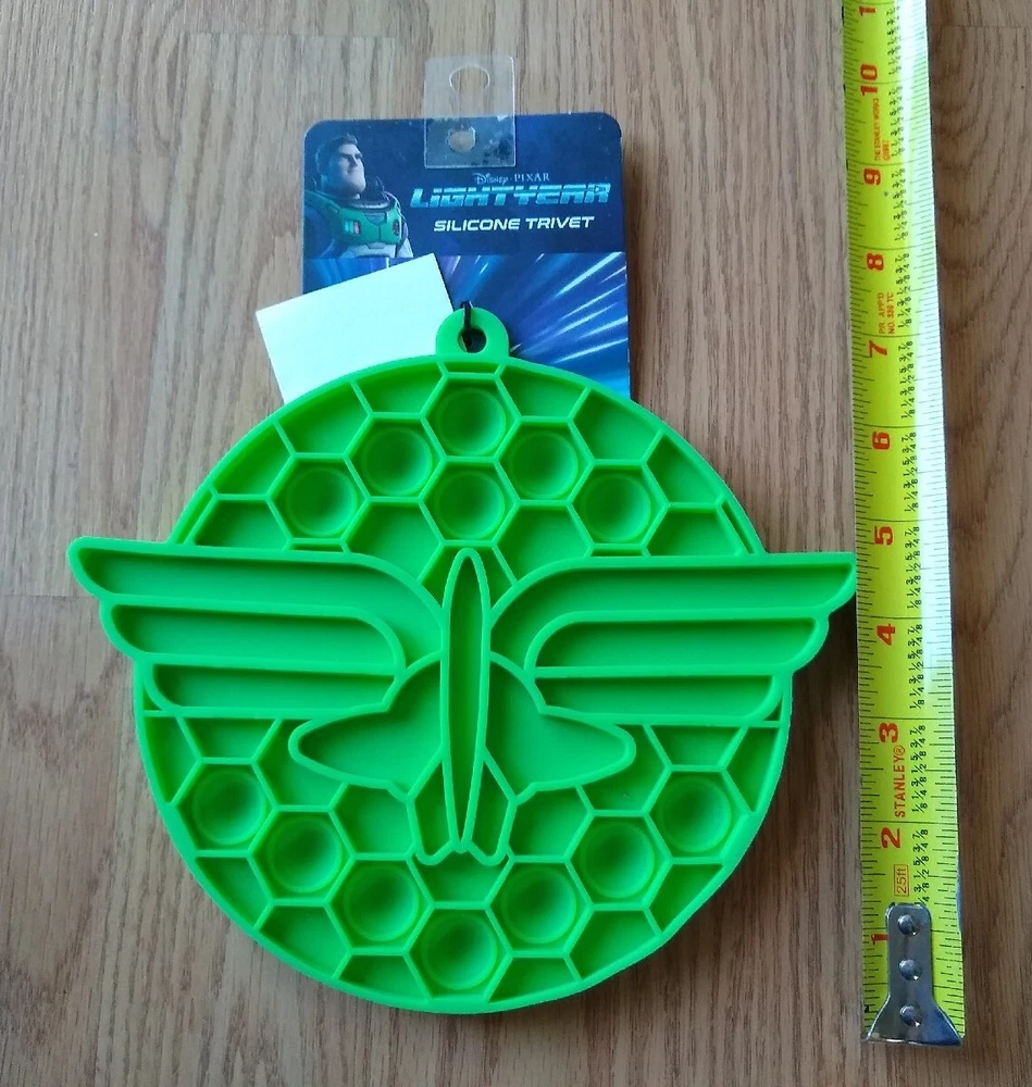 One green NEW IN PACKAGE Silicone trivet. Buzz Lightyear. Brand is Disney / Pixar. Approximate length is 7 inches. *****Item is from a smoke-free home. *****Feel free to email me with any questions. Thanks for looking!