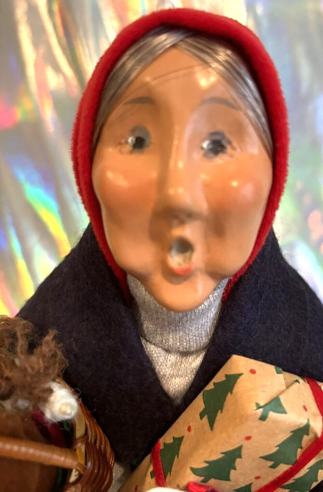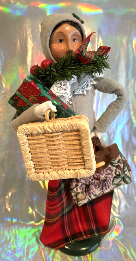This beautiful Byers' Choice figurine lot features three Victorian ladies with gifts, including one with a muff. From the Carolers collection. The intricate details and original design make this a perfect addition to any Christmas decor or collection. The figurines are perfect for collectors or as a special holiday gift. Tallest is 13.5" high. Made in the U.S.A. Good previously owned condition. Woman with muff has some wear on bottom of stand, just slightly seen when on display - please see last 3 photos. Woman with package and baskets made in 1997, woman with bag - 2001.