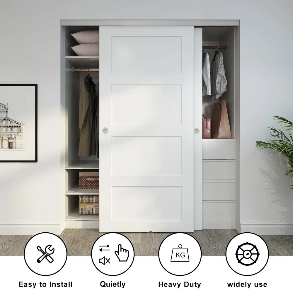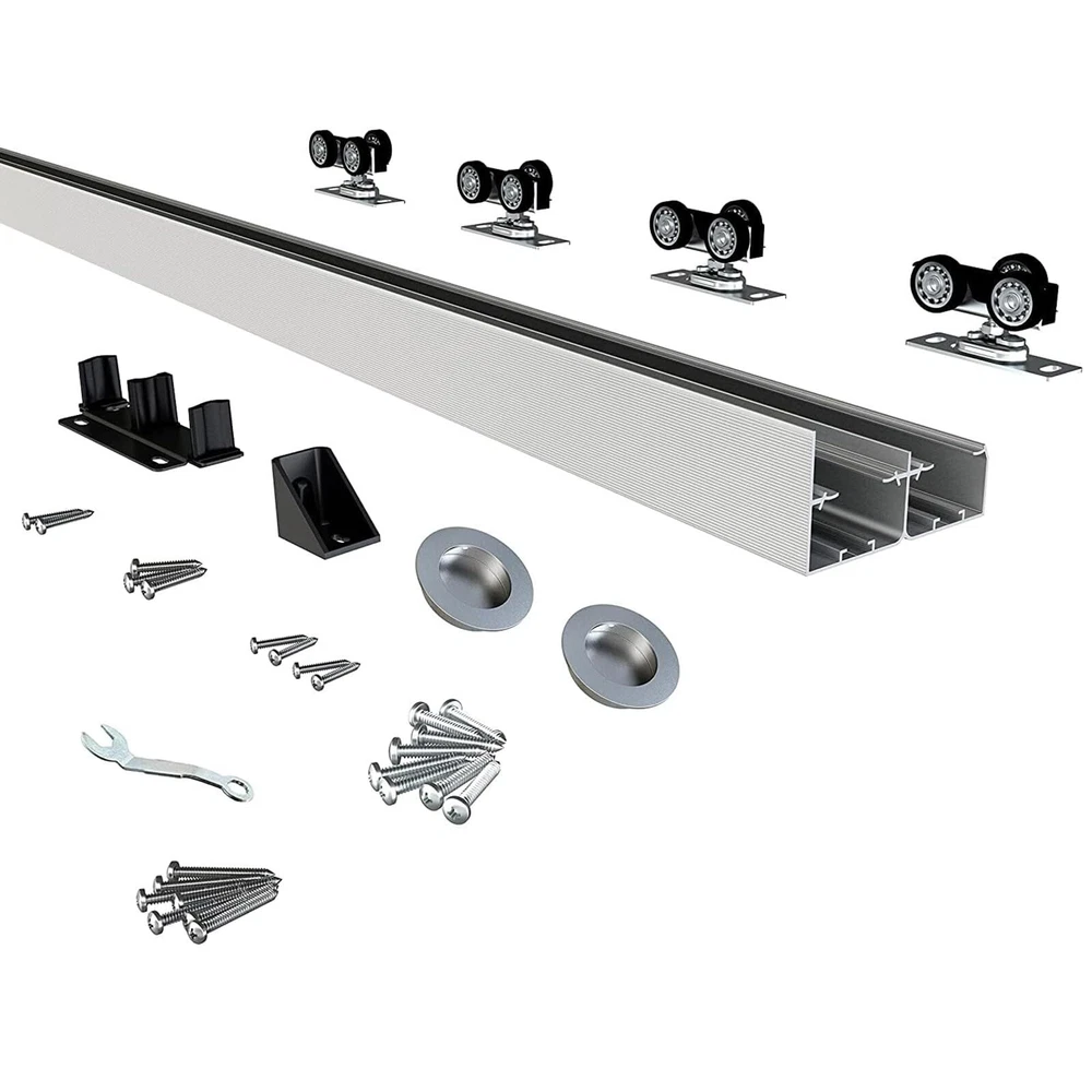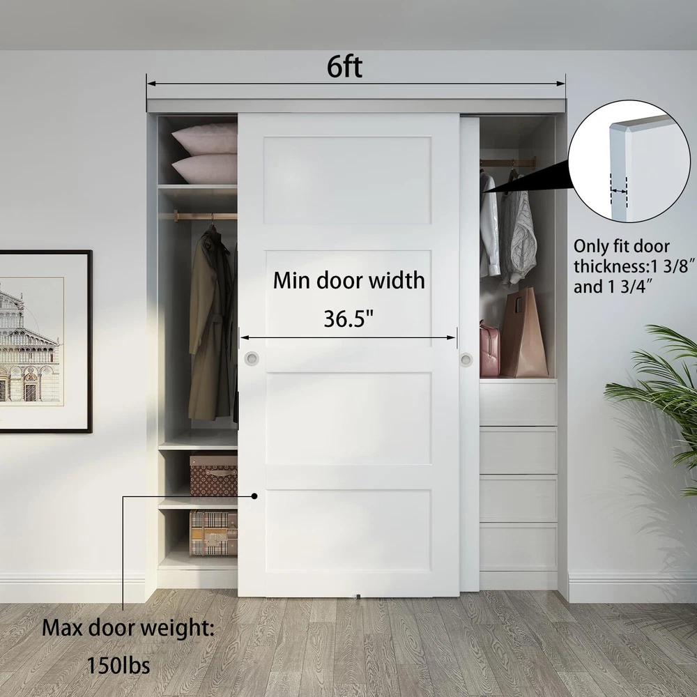 Specifications: Max Door Weight: up to 150lbs (68kg) per panel; Door panel thickness: 1 3/8" and 1 3/4"; Max Door panel width: 36 1/2"x2doors, track can be cut down to fit custom opening width(track length = 2 x door width -1"). Track dimension: 72"(L) x 4 3/4"(W) x 2 3/16"(H). High Quality: Commercial grade precision extruded aluminum box track ensures door will not jump from track, convex rails on track allow flexible and free rolling. Built-in front cover hides the sliding hardware from view. Smoothly and Quietly: Three wheel hangers guarantee all wheels carry door weight equally, with heavy-duty ball-bearing offer minimum friction and smooth, quiet rolling, tested beyond 100,000 rolls. Easy to Install: Quick release locking tab allows easy door installation/removal without dropping track. We also provide step-by-step graphic & text installation parsing manual. Widely Use: This track can be used for any space, living room, kitchen, bedroom, bathroom, laundry room, storage room, closet, study, checkroom, etc. Especially for low clearance. Quality Service: We are reliable and qualified manufacture of barn door and hardware. For any quality problems or missing parts, or installation problems, please let us know. Professional customer service team are whole day online to help you.