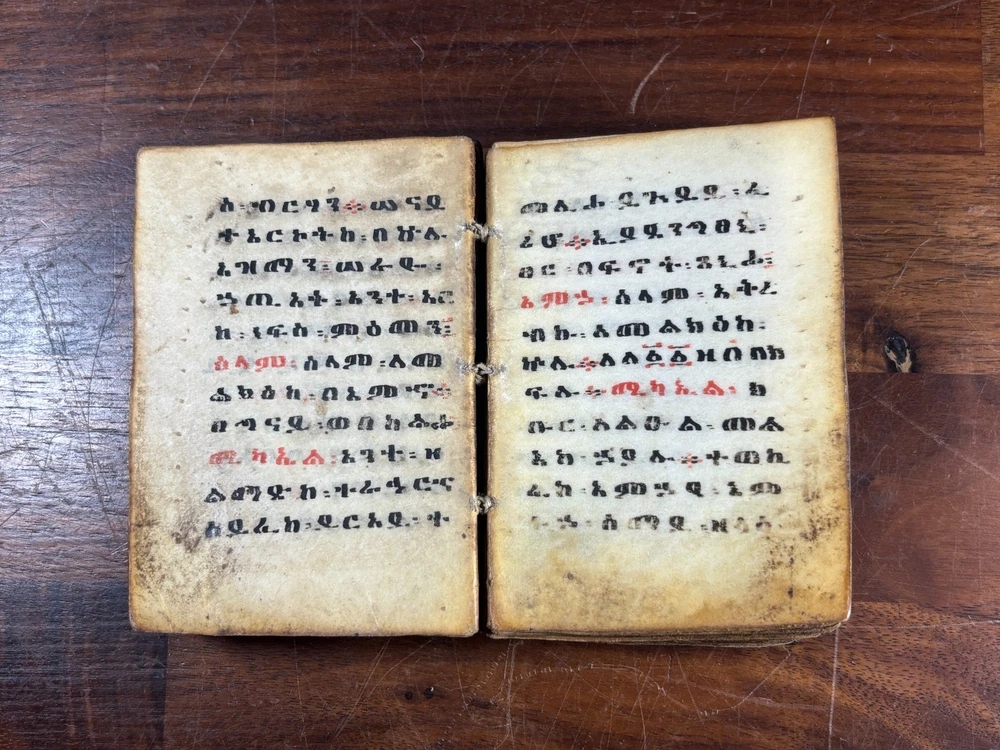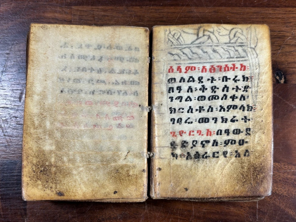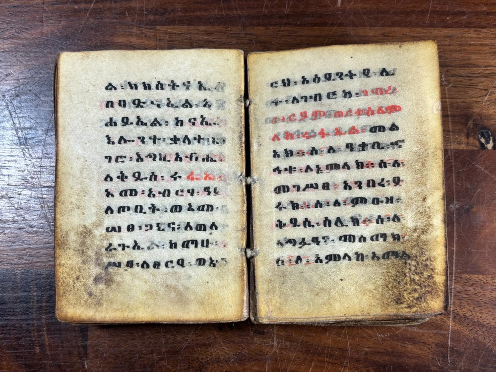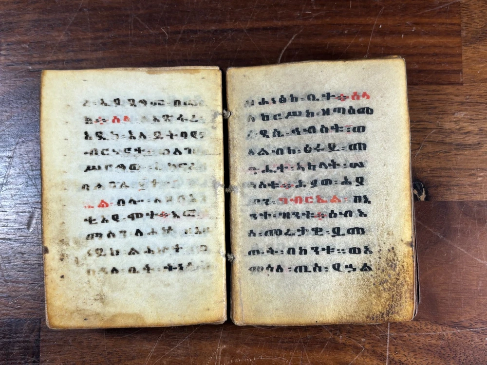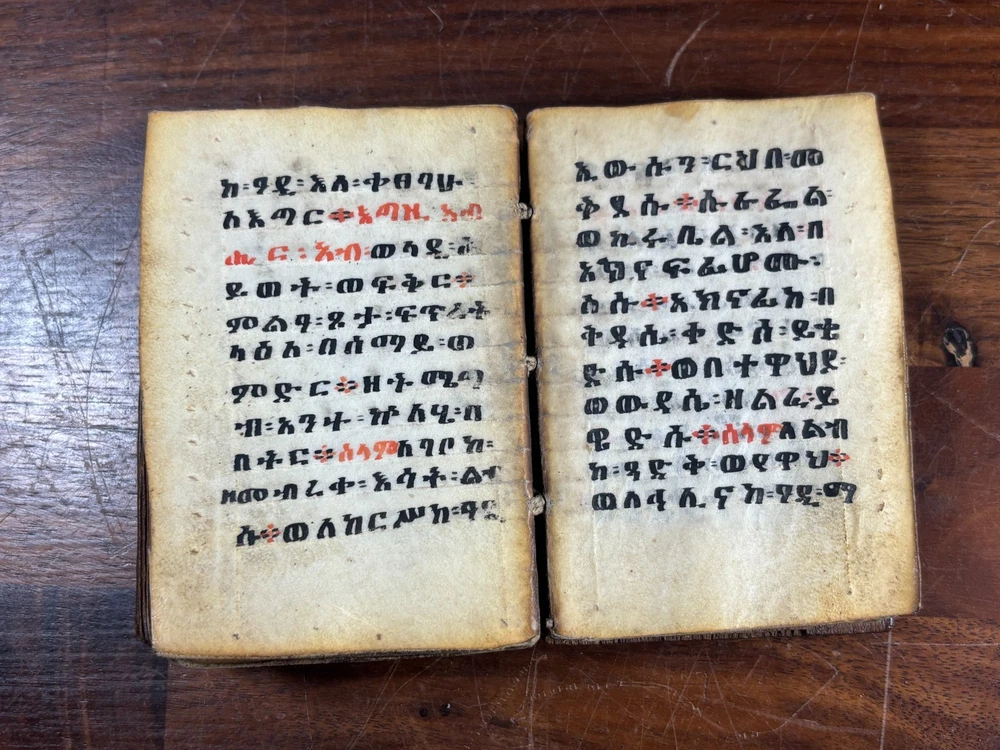 An authentic Ethiopian manuscript codex dating to approximately the mid-18th century (c. 1700s), accompanied by its original hand-made leather carrying satchel. This is a complete traditional set, preserved in the manner it would have been used and transported. The manuscript is handwritten on parchment (animal skin) in Geʽez, the sacred liturgical language of the Ethiopian Orthodox Tewahedo Church. The text is rendered in black ink with red rubrication highlighting sacred names and invocations. Bound between wooden covers and sewn with cord, the book retains its original structure and character, showing age and use consistent with its history. Included: Handwritten parchment manuscript book 158 Pages (79 leaves) Original wooden covers with cord binding Hand-stitched leather satchel with shoulder strap Physical Details (Manuscript): Material: Parchment Script: Geʽez Ink: Black with red rubrication Binding: Hand-sewn, wooden boards Format: Portable devotional codex Physical Details (Satchel): Material: Hand-worked leather Construction: Stitched and riveted Strap: Long shoulder strap for carrying Condition: Heavy wear consistent with age and use Content & Function: This manuscript is most consistent with a devotional prayer or protective religious text, rather than a complete Bible. Its portable size and the presence of a fitted satchel indicate it was intended to be carried—likely by a priest, monk, or lay practitioner—for daily prayer, blessing, or spiritual protection. Such manuscripts often include: Prayers and invocations Protective or healing texts References to God, Christ, the Virgin Mary, and archangels Liturgical formulas used in personal devotion An illustrated angel within the manuscript supports its role in protection and intercession. Translated Inscription: A partial reading of the opening page reveals a traditional invocation prayer (Roughly Translated): “In the name of God, the Lord, through Jesus Christ, may there be blessing and protection. By the power of the holy ones, guard and preserve the faithful from evil and affliction.” This reflects the devotional and protective nature typical of Ethiopian prayer manuscripts. Historical Context: Ethiopian manuscript traditions preserved ancient methods of bookmaking for centuries. Books like this were often produced by clergy and carried in leather satchels, making them both spiritual tools and personal objects of protection. The inclusion of the original satchel significantly enhances both authenticity and historical interest, as many manuscripts are separated from their cases over time. Condition: Manuscript: Age-related wear, staining, and fading; binding intact Satchel: Heavy wear, surface loss, and patina consistent with long-term use Collectability: A highly desirable example for collectors of: African and Ethiopian antiquities Religious artefacts Early manuscripts Ethnographic objects Complete sets with original satchels are increasingly scarce. Dimensions (W/ Slipcase/Satchel): Weight - 265g Height - 11.5cm Width - 9cm Thickness - 4.5cm