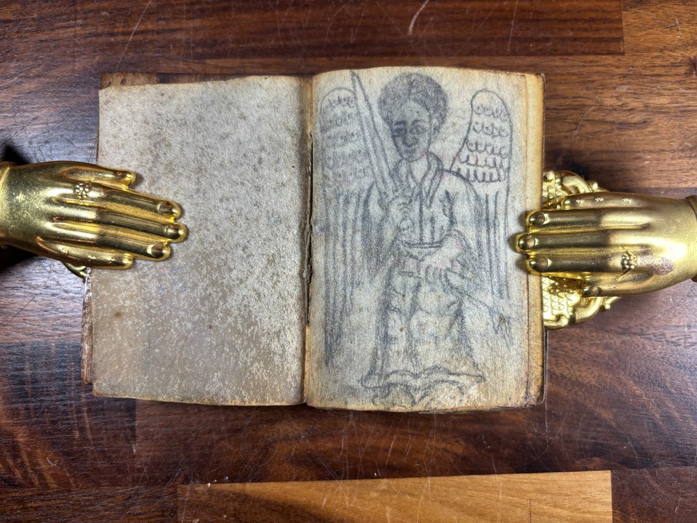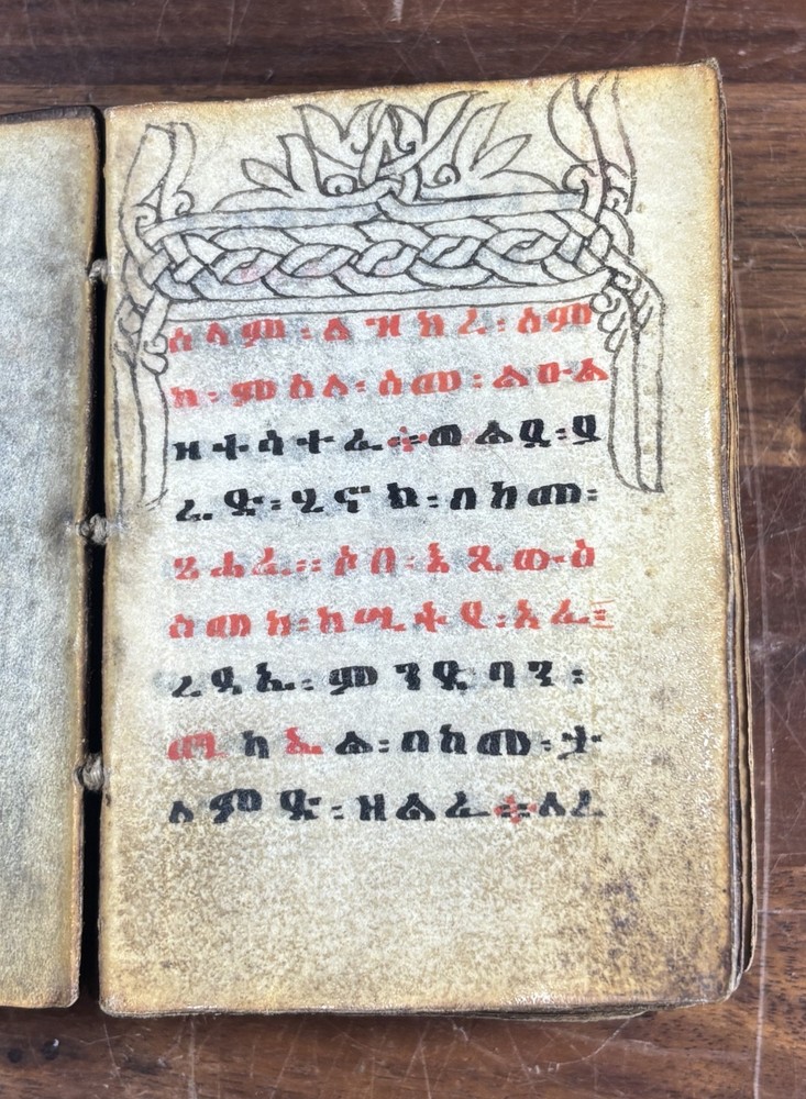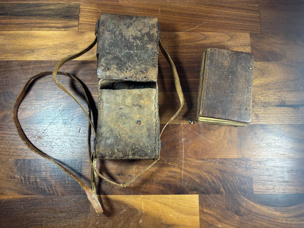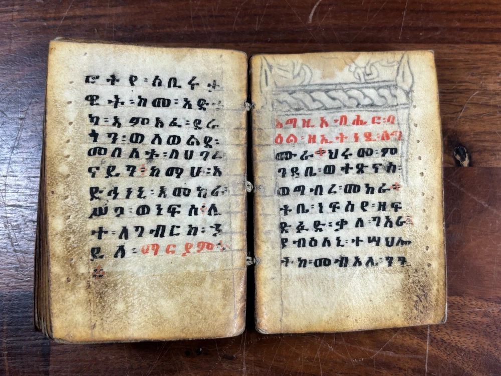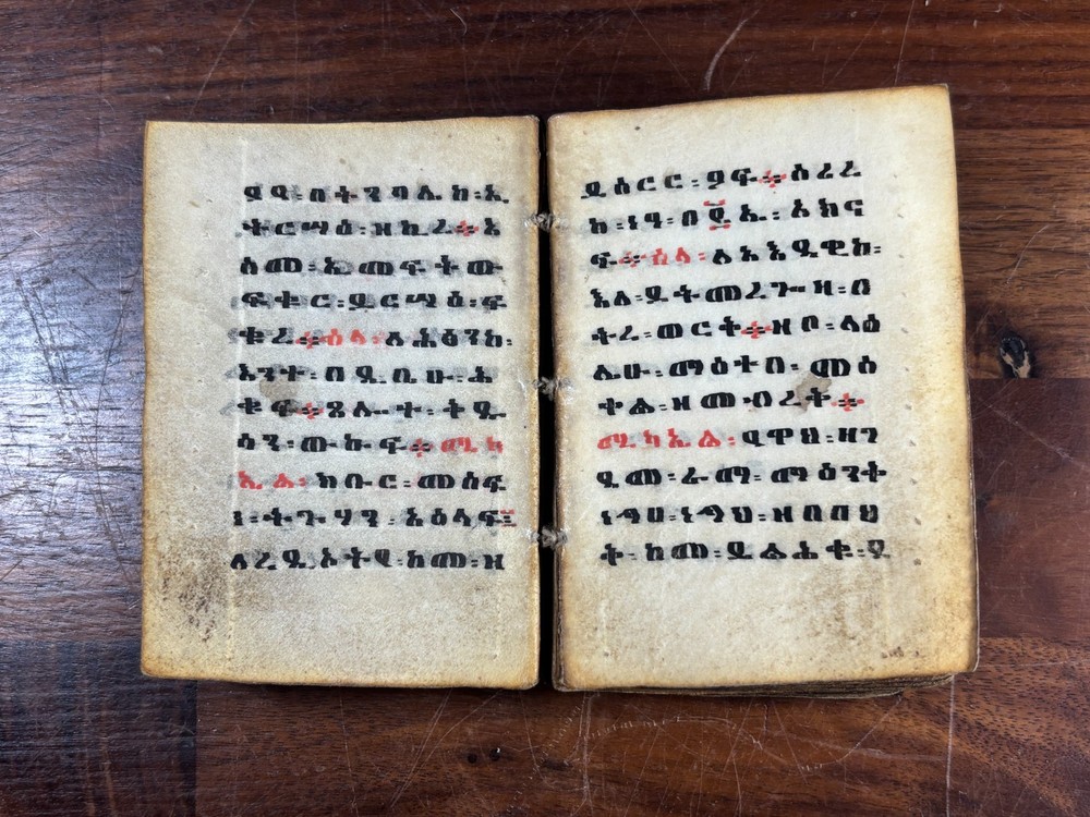 An authentic Ethiopian manuscript codex dating to approximately the mid-18th century (c. 1700s), accompanied by its original hand-made leather carrying satchel. This is a complete traditional set, preserved in the manner it would have been used and transported. The manuscript is handwritten on parchment (animal skin) in Geʽez, the sacred liturgical language of the Ethiopian Orthodox Tewahedo Church. The text is rendered in black ink with red rubrication highlighting sacred names and invocations. Bound between wooden covers and sewn with cord, the book retains its original structure and character, showing age and use consistent with its history. Included: Handwritten parchment manuscript book 158 Pages (79 leaves) Original wooden covers with cord binding Hand-stitched leather satchel with shoulder strap Physical Details (Manuscript): Material: Parchment Script: Geʽez Ink: Black with red rubrication Binding: Hand-sewn, wooden boards Format: Portable devotional codex Physical Details (Satchel): Material: Hand-worked leather Construction: Stitched and riveted Strap: Long shoulder strap for carrying Condition: Heavy wear consistent with age and use Content & Function: This manuscript is most consistent with a devotional prayer or protective religious text, rather than a complete Bible. Its portable size and the presence of a fitted satchel indicate it was intended to be carried—likely by a priest, monk, or lay practitioner—for daily prayer, blessing, or spiritual protection. Such manuscripts often include: Prayers and invocations Protective or healing texts References to God, Christ, the Virgin Mary, and archangels Liturgical formulas used in personal devotion An illustrated angel within the manuscript supports its role in protection and intercession. Translated Inscription: A partial reading of the opening page reveals a traditional invocation prayer (Roughly Translated): “In the name of God, the Lord, through Jesus Christ, may there be blessing and protection. By the power of the holy ones, guard and preserve the faithful from evil and affliction.” This reflects the devotional and protective nature typical of Ethiopian prayer manuscripts. Historical Context: Ethiopian manuscript traditions preserved ancient methods of bookmaking for centuries. Books like this were often produced by clergy and carried in leather satchels, making them both spiritual tools and personal objects of protection. The inclusion of the original satchel significantly enhances both authenticity and historical interest, as many manuscripts are separated from their cases over time. Condition: Manuscript: Age-related wear, staining, and fading; binding intact Satchel: Heavy wear, surface loss, and patina consistent with long-term use Collectability: A highly desirable example for collectors of: African and Ethiopian antiquities Religious artefacts Early manuscripts Ethnographic objects Complete sets with original satchels are increasingly scarce. Dimensions (W/ Slipcase/Satchel): Weight - 265g Height - 11.5cm Width - 9cm Thickness - 4.5cm