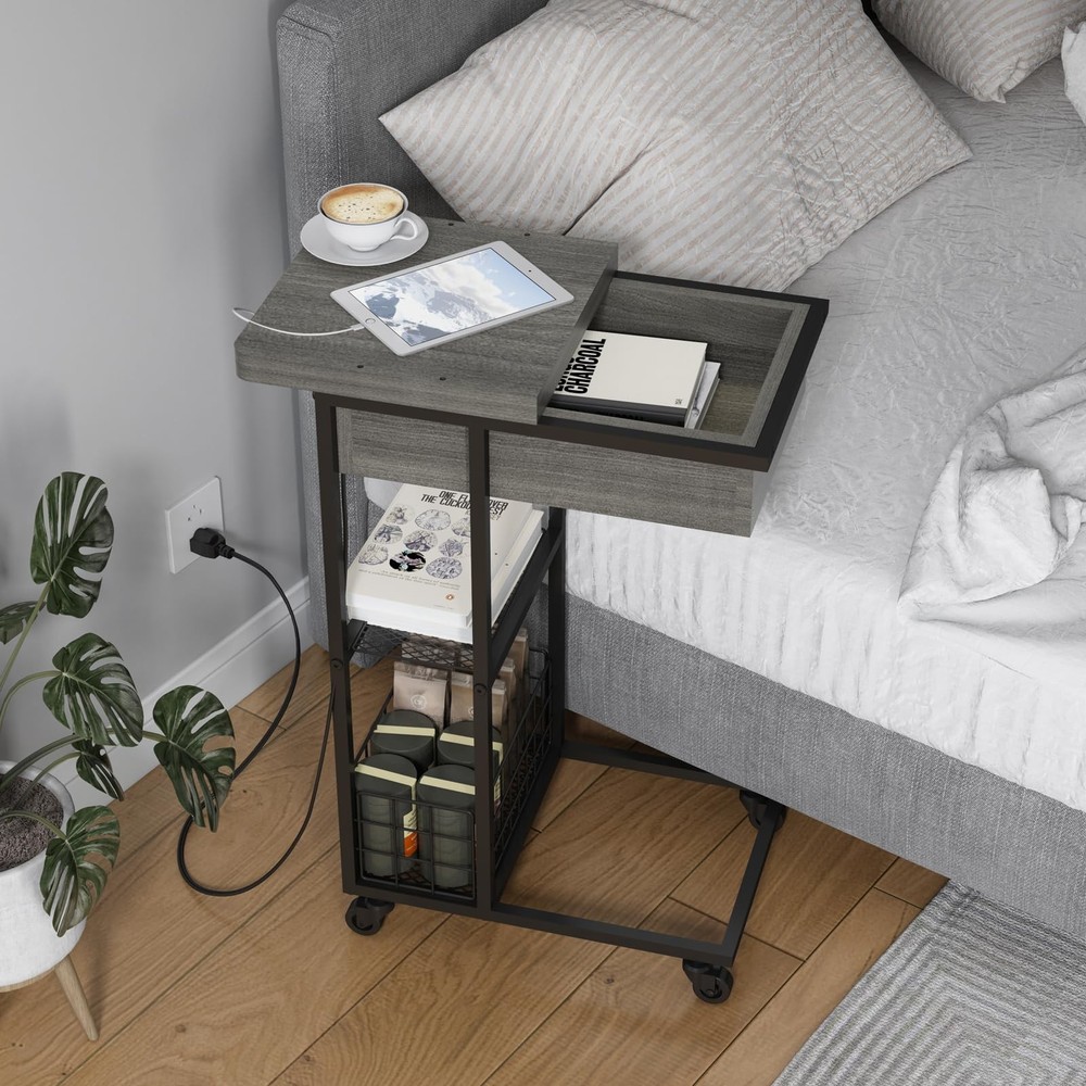 C Shaped End Table with Charging Station Patented Design: Uniquely Designed C Shaped Side Table with Charging Station, a Flip Top Drawer and 2 Tiers Storage Basket Shelf, small side table offers you ample space to storage, meets your charging needs when using electronic devices, within your arm's reach. Upgraded Version - The Charging Station is Designed on Your Left Vertical Side, which is safer to use. You don’t have to worry about electric shock caused by spilled coffee, water, etc. With 2 x USB Ports & 2 x 3-Prong Power Outlets - Low Battery Where is Power Outlet? No need to look around it’s within your arm’s reach. Also, the electrical cord is 6.5 ft long, enough to keep you away from wall corner where the home power outlet located. Thanks to the C-shaped Design, this C shaped sofa table can easily hug the side of your sofa or chair, you can also tuck it under your bed for more convenient use. NOTE: The height from the bottom of the wheel to the top of the base is 2.9”. The Attention to User Safety in Every Design Detail - First, the charging station is designed on the left vertical side instead of tabletop, keeping it away from spilled water. Secondly, the four corners of the tabletop are designed to be round so as not to hurt people. Multi-functional C-Shaped Table - Can be used as a side table, end table, bedside table, sofa table, nightstand, charging table, living room end tables, or bed tables adjustable over the bed. It is not only a C table, but also a side table with storage space, hidden drawer space with 2 shelves, the combination of privacy and open storage makes it more convenient for you to work from home, ideal for small spaces.