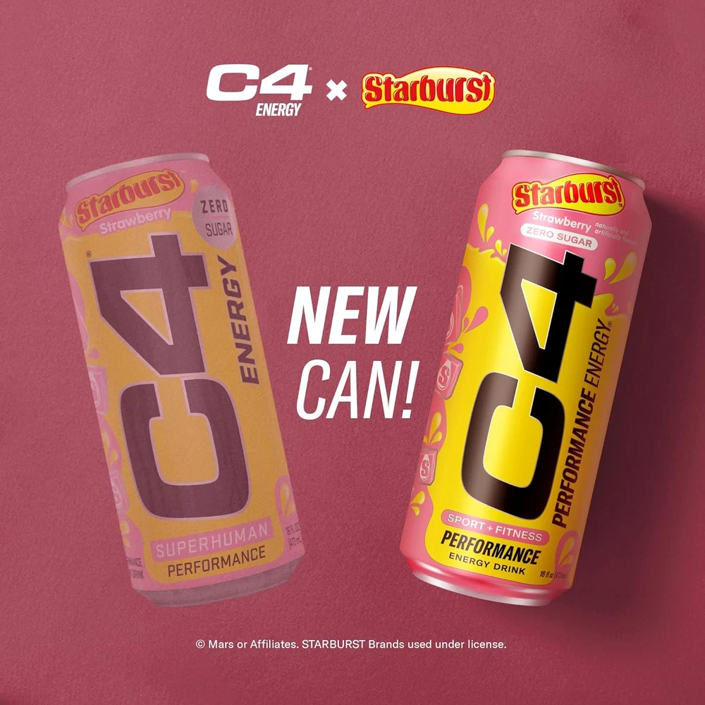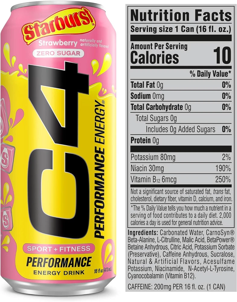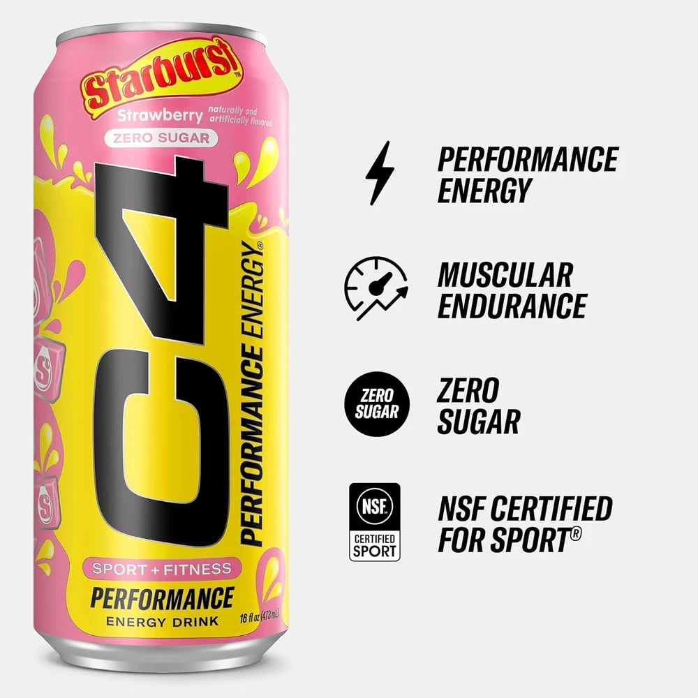 EXPLOSIVE ENERGY. JUICY FLAVOR. ENERGY TO OUTPERFORM - Formulated with 200mg Caffeine to support explosive energy and physical performance when you need it most whether it’s in the gym, on the field, in your home, or wherever your fitness journey may take you INCREASE REP COUNT & HYDRATION - Formulated with CarnoSyn Beta-Alanine, a premium clinically studied beta-alanine, studied to support muscular endurance and fight fatigue, and BetaPower Natural Betaine that supports muscle cell hydration and physical performance SUGAR-FREE BEVERAGE FOR MEN & WOMEN - Zero sugar and zero carbs in every delicious serving with no artificial colors or dyes With the new STARBURST candy flavors, you get your candy fix with zero sugar, zero carbs, and no artificial colors or dyes. Now that’s an unexplainably juicy, and delicious way to outperform and overachieve. THE BEST OF BOTH WORLDS — C4 PERFORMANCE ENERGY® AND STARBURST™ CANDY. EXPLOSIVE ENERGY. JUICY FLAVOR.: We’ve launched the most epic partnership with STARBURST™ candy to bring you 4 NEW JUICY FLAVORS — Strawberry, Cherry, Orange, Lemon! C4 Performance Energy® is infused with the heritage and technology of America's Most Explosive Performance Energy Brand. Powered by 200mg of caffeine, you’ll be burstin’ with explosive energy to elevate your performance. Add the clinically studied CarnoSyn® Beta-Alanine and superfood extract, BetaPower® Betaine, and you can count on refreshing cellular hydration and endurance with every sip! With the new STARBURST™ candy flavors, you get your candy fix with zero sugar and no artificial colors or flavors. Now that’s an unexplainably juicy, and delicious way to outperform and overachieve!