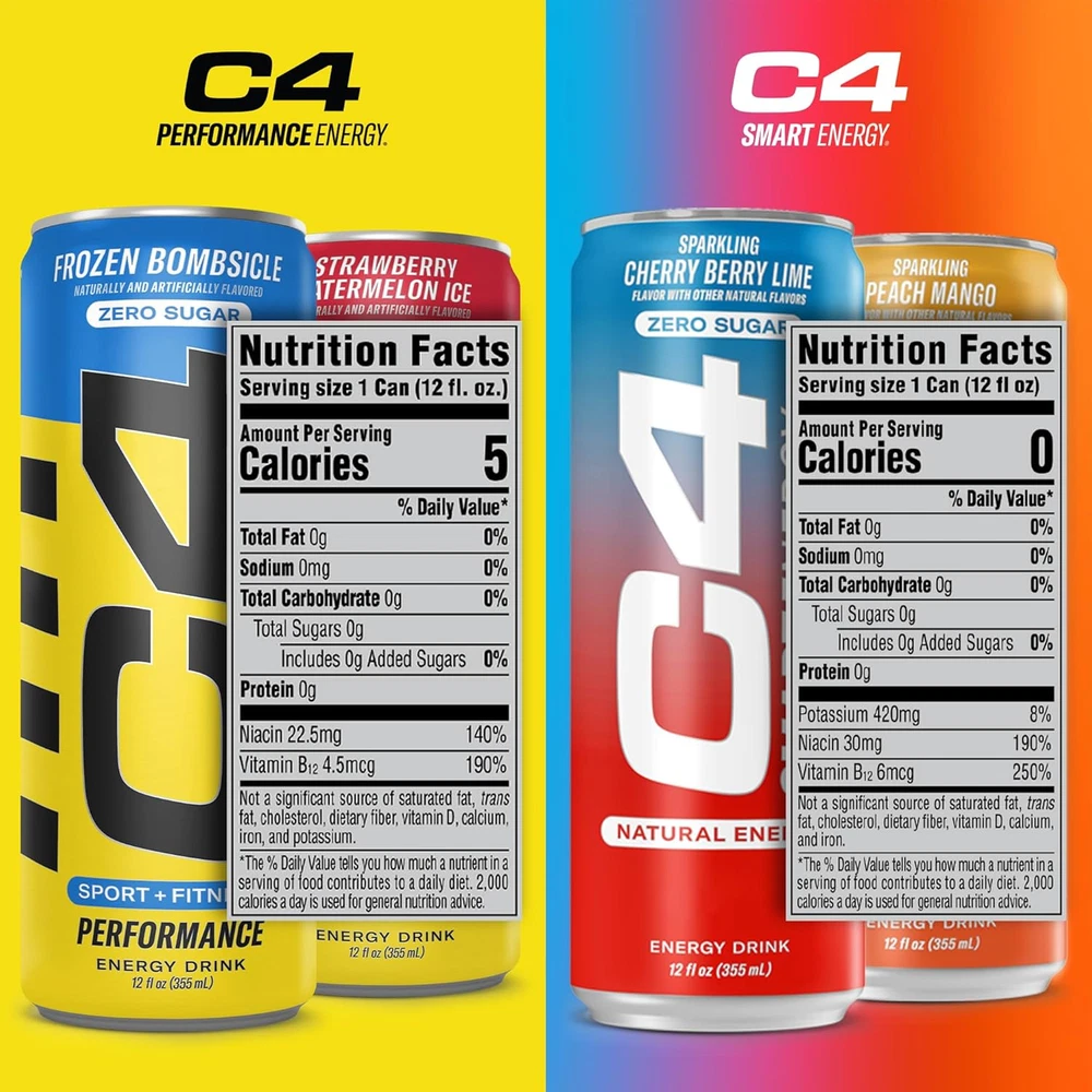 C4 SUGAR-FREE ENERGY DRINK - America's Selling Pre-Workout Brand has been trusted since 2011 with over 2 billion servings sold C4 SMART ENERGY DRINK - Formulated with 200mg of InnovaTea Naturally Derived Caffeine produced from tea leaves that delivers anytime energy and alertness. Conquer any task from work to play, gaming to studying, partying to planning to pre workout. C4 ENERGY PERFORMANCE DRINK - Formulated with 150mg Caffeine to support explosive energy and physical performance when you need it most whether it’s in the gym, on the field, in your home, or wherever your fitness journey may take you SUGAR-FREE BEVERAGE FOR MEN & WOMEN - Zero sugar and zero carbs in every delicious serving with no artificial colors or dyes DELICIOUS FLAVORS UNLIKE ANYTHING ON THE MARKET - Starburst, Skittles, Hawaiian Punch, Frozen Bombsicle, Orange Slice, Strawberry Watermelon Ice, and more! The delicious sugar-free energy drinks, C4® Energy and C4® Smart Energy, are engineered to support the physical and mental demands of your day and the C4® Brain & Body Bundle Variety Pack is built to help you outperform and overachieve.