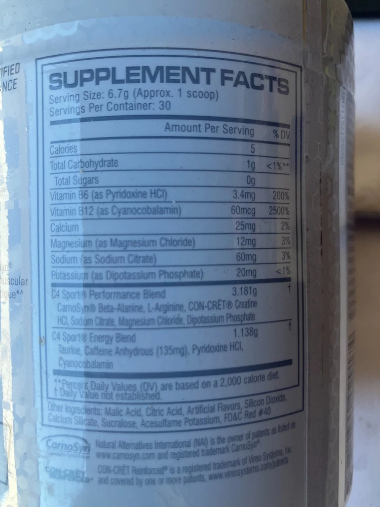 Item Weight: 7.1 oz Expiration Date: 7/2026 MPN: Does not apply Active Ingredients: Micronized Creatine Monohydrate, CarnoSyn(R) Beta-Alanine, Arginine Alpha Ketoglutarate, Sodium Citrate, Magnesium Chloride, Dipotassium Phosphate Dosage: 6.7 g Type of Diet: Bodybuilding, Fitness, Gym & Training gtin13: Does not apply Department: Men, Unisex Features: NSF Certified UPC: Does not apply Supply: 1 Month and Longer When to Take: Before Meal, Before Workout, During Workout Country/Region of Manufacture: United States Brand: Cellucor Main Purpose: Pre Workout Energy Type: Supplement Ingredients: Micronized Creatine Monohydrate, CarnoSyn(R) Beta-Alanine, Arginine Alpha Ketoglutarate, Sodium Citrate, Magnesium Chloride, Dipotassium Phosphate Flavor: Watermelon Volume: 7.1 fl oz Formulation: Powder