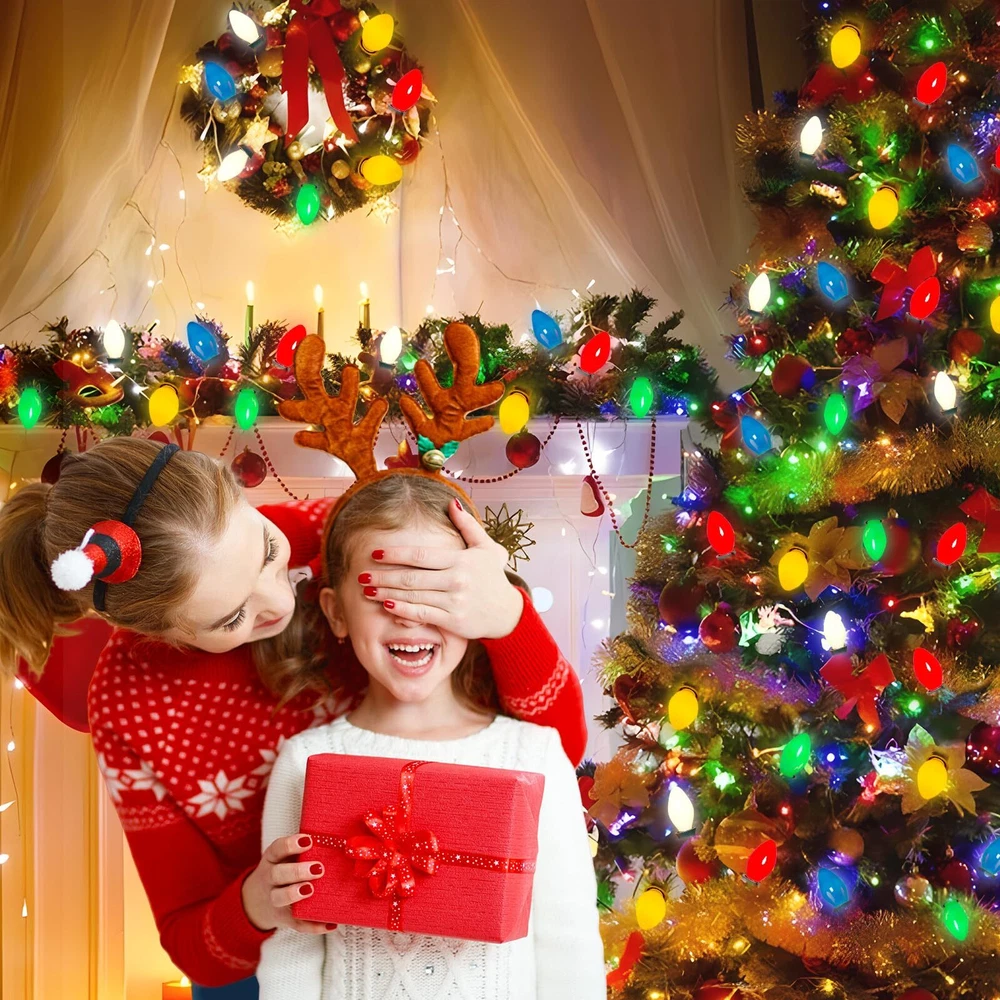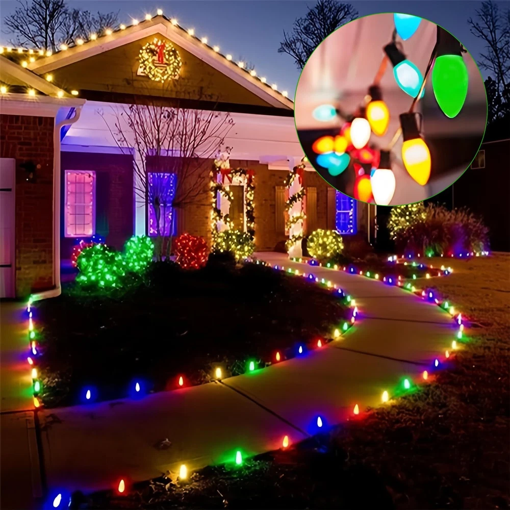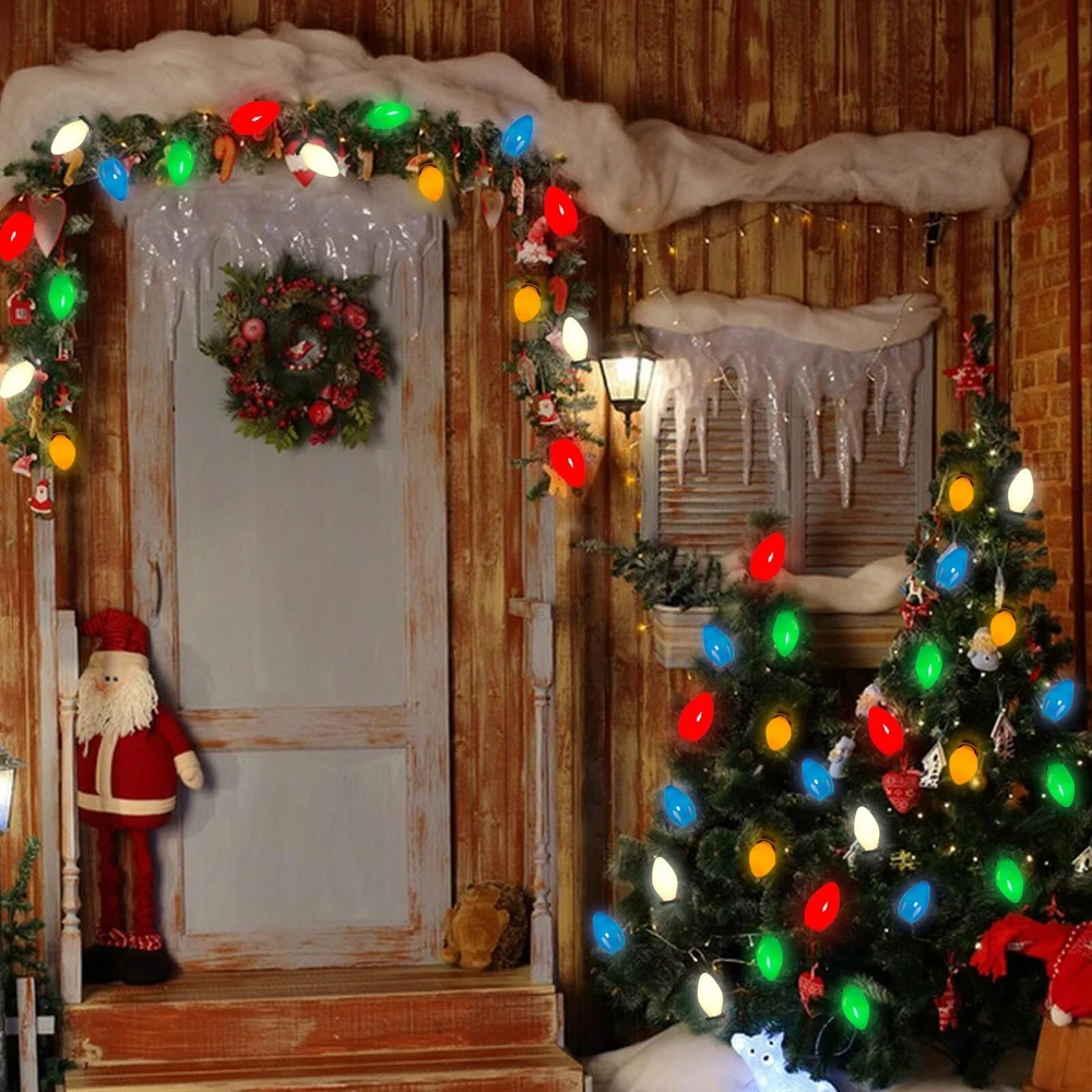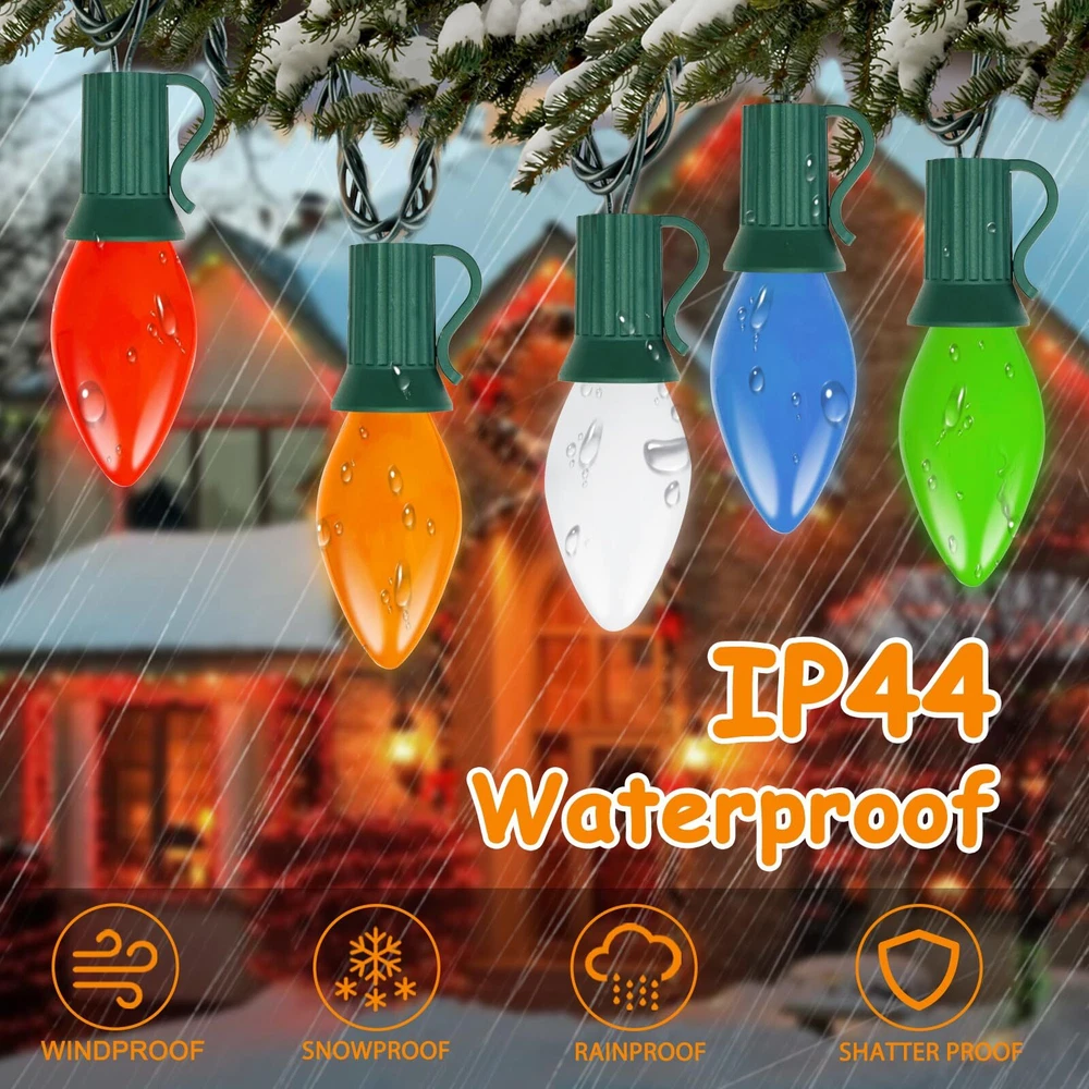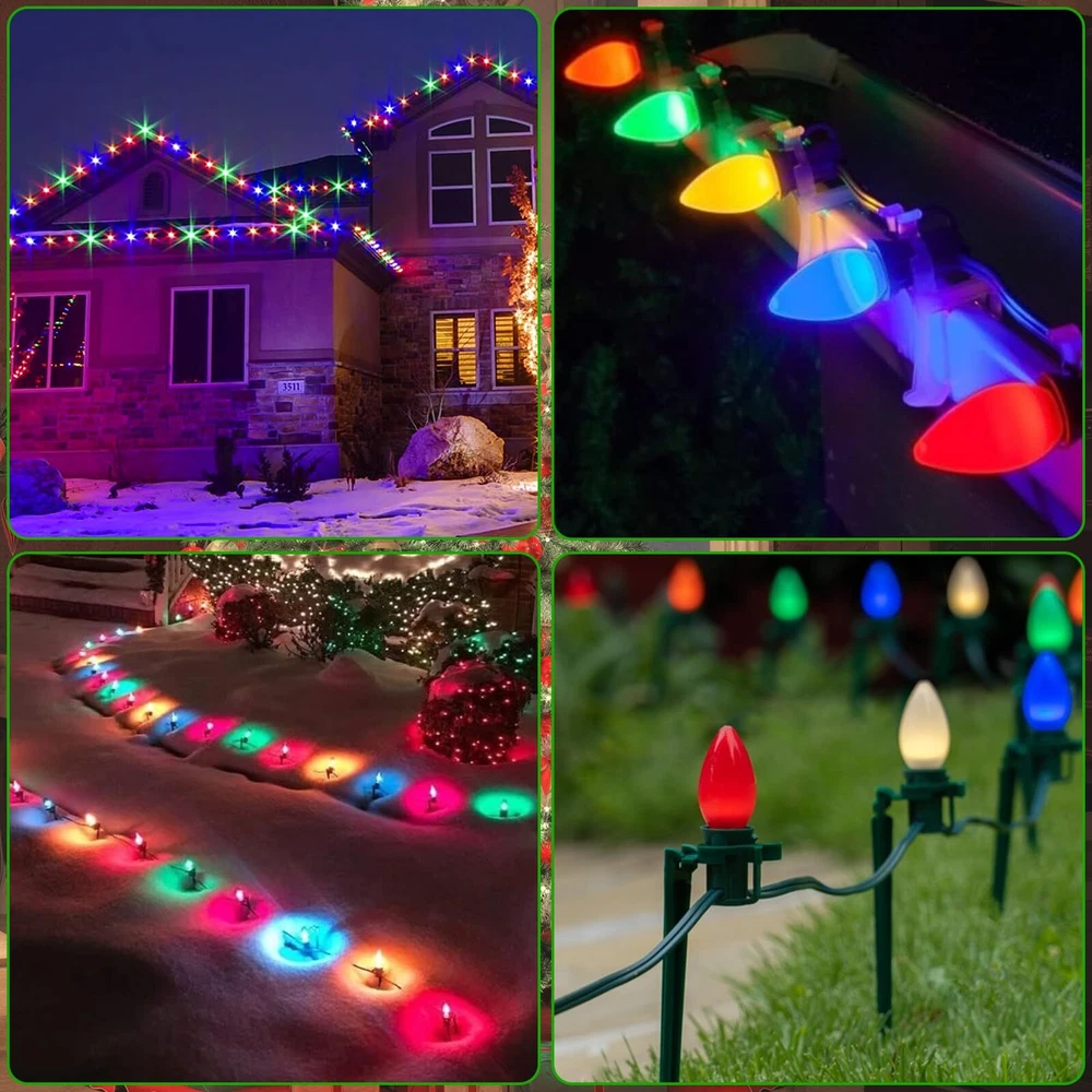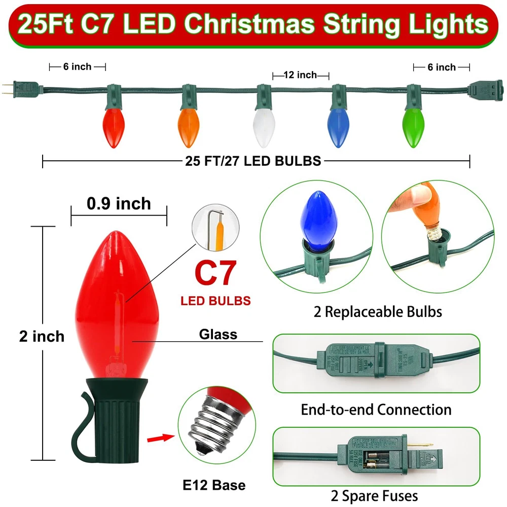 π End to End Connectable: 25Ft C7 led christmas lights waterproof 6 ''lead with male plug, 12 ''spacing between bulbs, 6 '' tail with female connector, total length 25 feet. 25Ft vintage led christmas lights can connect up to 28 strand to meet your needs(700 FT), you can hanging led outdoor christmas in garden, patio, Christmas tree decoration and lighting π C7 Multicolor LED Bulbs: C7 LED christmas lights bulbs with E12 / C7 candelabra socket base. 0.6W/120V per bulbs, 2700K warm white, Energy-saving light bulbs do not generate heat, and the temperature is lower than that of traditional incandescent bulb. If one bulb burnt, the others will steady lit. π Vintage C7 Christmas multicolor string lights: C7Led christmas string lights outdoor combine with multicolor ceramic bulbs glow a natural warm, create a vintage effect or antique ambiance & romantic atmosphere π UL Listed and Weatherproof : This outdoor string lights is Water-proof IP44 and durable.They can withstand extreme temperatures, rain, wind, and damp climates. Opaque Ceramic LED Christmas Light shell is made of thickened glass for more durability, waterproof, UL Certified for outdoor & indoor use, Connectable commercial grade outdoor indoor Xmas decorative Light π Widely Used: Vintage christmas outdoor led string light socket have small clips, easy to hanging christmas tree, roof, decorating your home, Xmas, holidays, backyard, garden, patio, wall, window, party and every occasion lighting and decorations.For C7 LED replacement bulbs, please search asin "B0CH4RFN6B".