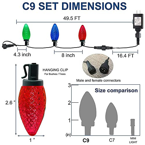 Menu 1. We require immediate payment. 2. We currently accept payment via eBay managed payments only. 3. Once payment is cleared, we will dispatch your shipment within 1-3 business days. Please refer to the "Shipping" tab for more information regarding shipping speed to your destination. C9 Christmas Lights Outdoor,50 LED 33ft Waterproof Green Wire String Lights, Indoor Outdoor Fairy Lights for Christmas Tree, Xmas Yard, Party, Wedding Decorations (Multi Colored) Product description 50 LED C9 Christmas Lights: C9 Christmas lights come with 50 bright multicolored LED lights, The green cord is suitable for Christmas tree decoration. The exquisite string light has super long 16 FT leading wire, light length is 33 FT, total length is 49 FT. Add a festival warm atmosp to your home. End to End Connectable: Can connect up to 4 sets lights (Max 200 LED), connect according to the size of the scene you need to decorate, to meet the needs of various venue decorations to the greatest extent. Decorating your home with fairy string lights, creating a romantic festival vibe, enjoy the pleasure festive holiday with your family. Waterproof & Safety: Both the vintage string lights and transformer are IP 44 waterproof. The fairy lights work with 29V, is safety to touch. Suitable for outside using no matter the weather is rain or snow. Note: Please protect the plug from being immersed in water. Premium Quality: The C9 light bulb covers are made of high quality PVC material is sturdy and made to last, the update LED bulbs is more bright than other LED or incandescent bulbs, and it will help you save more energy than tranditional bulbs. Perfect Christmas Decorations: The exquisite C9 Christmas tree lights is suitable for outdoor indoor Xmas, holiday decorations, ideal for garden, yard, lawn, home, patio, bedroom, Christmas tree, wedding, thanksgiving day decor. Ideal Christmas gift for your friends, family and colleagues. PLEASE MESSAGE US IF YOU HAVE ANY OTHER QUESTIONS, AND MANY THANKS FOR READING ALL OF THIS. Copyright ©#. All Rights Reserved.
