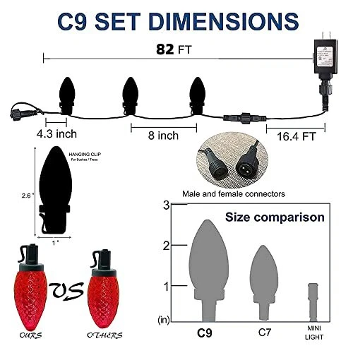 Menu 1. We require immediate payment. 2. We currently accept payment via eBay managed payments only. 3. Once payment is cleared, we will dispatch your shipment within 1-3 business days. Please refer to the "Shipping" tab for more information regarding shipping speed to your destination. C9 Christmas String Lights, Waterproof Connectable Green Wire Fairy Lights, Christmas Lights for Indoor Outdoor Home Yard Xmas Tree House Decorations (Red, 100 LED) Product description Light Specifications: With 100 LED C9 string lights, each Christmas string lights is 82.5 ft long in total, wire with LED bulbs is 66 ft, lead wire without lights is 16.4 ft, spacing between per LED bulb is 8 inch. 29V low voltage, keep at a low temperature state after lighting up for hours, ensure the safety. End-to-End Connectable: Each C9 string lights come with male and female connectors, connect up to 3 sets together, expandable up to a long 198 ft length, allow you to decorate your lighting area with the desired length. Waterproof Outdoor Christmas Lights: IP44 Waterproof,popular Christmas C9 string lights can withstand all kinds of weather! Suitable for both outdoor & indoor decorations. Please note that the adapter is not waterproof, please kindly protect the power adapter from the water! Premium Quality: The C9 string light bulb covers are made of high quality material is sturdy and made to last, the update LED bulbs is more bright than other LED or incandescent bulbs, and it will help you save more energy than traditional bulbs. Widely Application: Our 100 LED C9 string lights can be used both indoor and outdoor, as Christmas, Halloween, Xmas tree, party, wedding, bedroom, bar, window, holidays, festivals, shows, restaurants, hotels, shopping centers, patio, porch, perfect atmosp they can add at any applications. PLEASE MESSAGE US IF YOU HAVE ANY OTHER QUESTIONS, AND MANY THANKS FOR READING ALL OF THIS. Copyright ©#. All Rights Reserved.