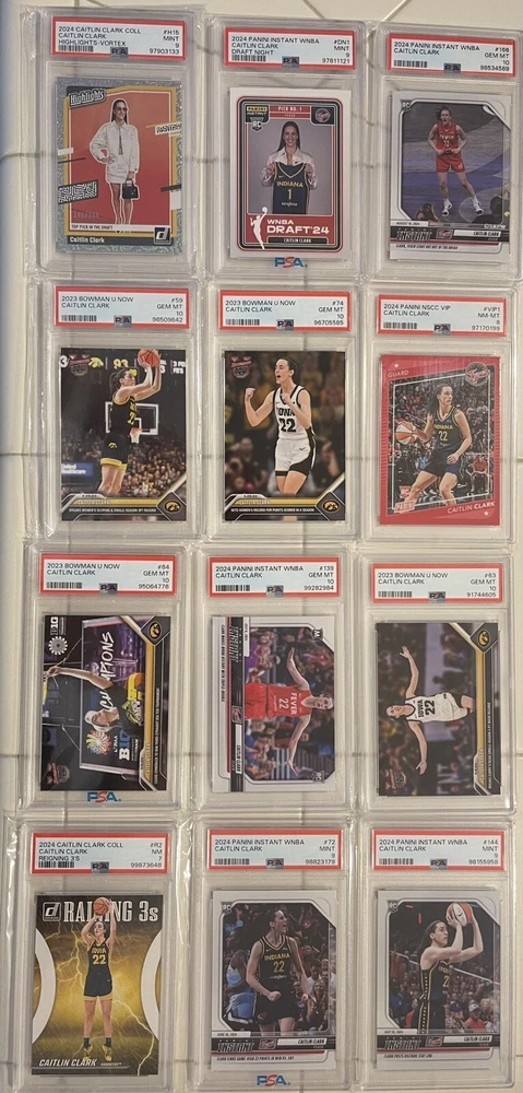 LOOKING TO GAUGE INTEREST IN MY LOT OF 12 GRADED CAITLIN CLARK ROOKIE CARDS! The List & Grades of Cards Below Coordinate With the Photo! Cheers; 2024 Caitlin Clark Coll Highlights-Virtex PSA 9 MINT #H15 2024 Panini Instant WNBA Caitlin Clark Draft Night PSA 9 MINT #DN1 2024 Panini Instant WNBA Caitlin Clark PSA 10 GEM MT #166 2023 Bowman U Now Caitlin Clark PSA 10 GEM MT #59 2023 Bowman U Now Caitlin Clark PSA 10 GEM MT #74 2024 Panini NSCC VIP Caitlin Clark PSA 8 NM-MT #VIP1 *hard to find/get* 2023 Bowman U Now Caitlin Clark PSA 10 GEM MT #64 2024 Panini Instant WNBA Caitlin Clark PSA 10 GEM MT #139 2023 Bowman U Now Caitlin Clark PSA 10 GEM MT #63 2024 Caitlin Clark Reigning 3’s PSA 7 NM #R2 *cool find* 2024 Panini instant WNBA Caitlin Clark PSA 9 MINT #72 2024 Panini instant WNBA Caitlin Clark PSA 9 MINT #144 Though I Will Have This Caitlin Clark Lot Listed for a “Buy Now” Price, PLEASE FEEL FREE TO SEND REASONABLE OFFERS FOR THIS LOT, WILL ENTERTAIN AND NEGOTIATE REAL OFFERS :)