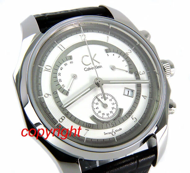 WE DO NOT SELL REPLICAS! 100% BRAND NEW AND AUTHENTIC! *SELLER RETIRING*SUPER CLEARANCE* MEN'S CALVIN KLEIN K7731120 SWISS MADE PRECISION SWISS QUARTZ MOVEMENT ACCURATE TO WITHIN 15 SECONDS MONTHLY 5 MINUTE RETROGRADE STOPWATCH SUB-DIAL 60 MINUTE RETROGRADE SUB-DIAL SMALL SECOND HAND SUB-DIAL WHITE DIAL LUMINESCENT HANDS DATE CALENDAR SAPPHIRE CRYSTAL SOLID STAINLESS STEEL CASE AND BUCKLE WITH ENGRAVED LOGO POLISHED/BRUSHED STEEL FINISH GENUINE BLACK LEATHER STRAP 30M WATER RESISTANT CASE MEASURES 42mm ACROSS EXCLUDING CROWN CASE IS 13mm HIGH LUG SIZE IS 22mm WEIGHS 2.8oz (80g) MAXIMUM WRIST SIZE IS 9" COMES IN CALVIN KLEIN PRESENTATION GIFT BOX MSRP $490