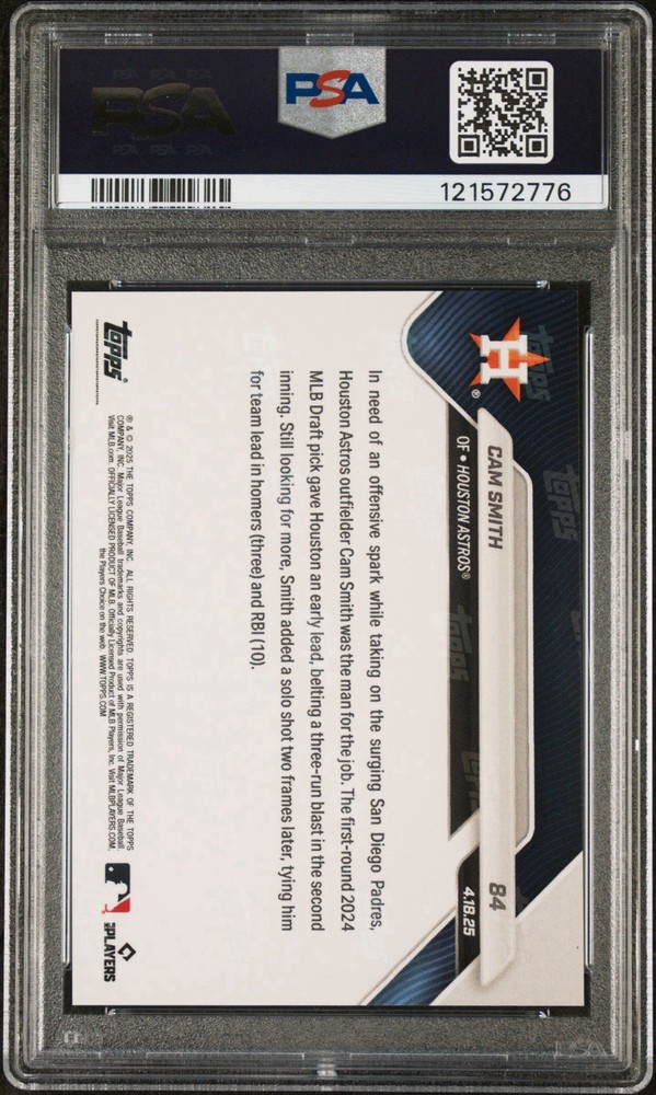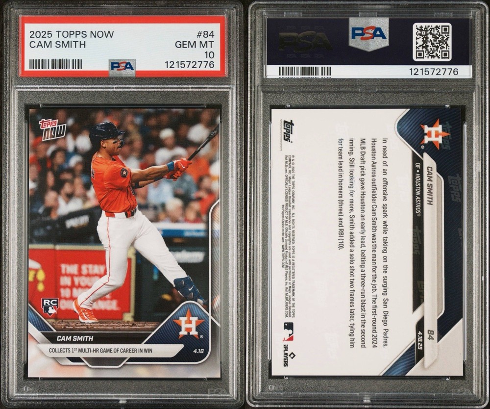 The 2025 Topps Now Cam Smith #84 (RC) trading card is a highly sought-after collectible featuring the rookie player from the Houston Astros. With a limited print run of 1669, this graded card holds value for baseball enthusiasts and collectors alike. Manufactured by Topps and professionally graded by Professional Sports Authenticator (PSA), this sports trading card is a key piece in any baseball card collection, showcasing the promising talent of Cam Smith in the Major League Baseball (MLB) season of 2025.