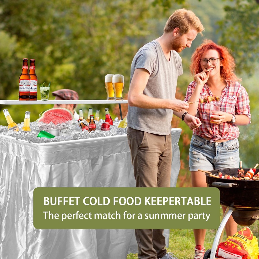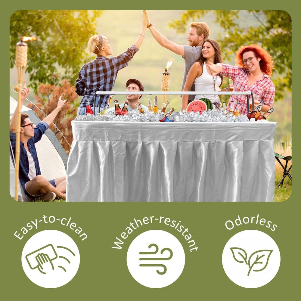 cooler table portable bar outdoor cooler table party tables drink table camping table portable bar table for events drink cooler drink cooler for parties cocktail tables for parties Keep your drinks cold and your guests happy with this convenient folding ice table with drain and skirt, perfect for outdoor parties and events Easily transport this portable bar and camping table to any location, whether it's a backyard BBQ or a camping trip The included skirt adds a touch of elegance to your setup, drink cooler for parties making it a versatile option for all types of gatherings Say goodbye to messy spills with the built-in drain, this party tables ensuring easy cleanup and maintenance at your next party Make a statement at your next event with this stylish and functional drink cooler that doubles as a cocktail tables for parties