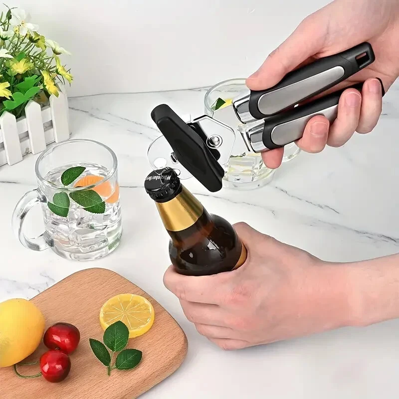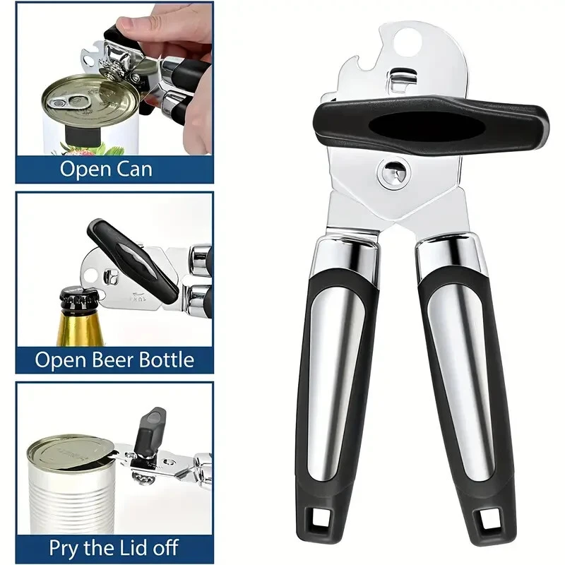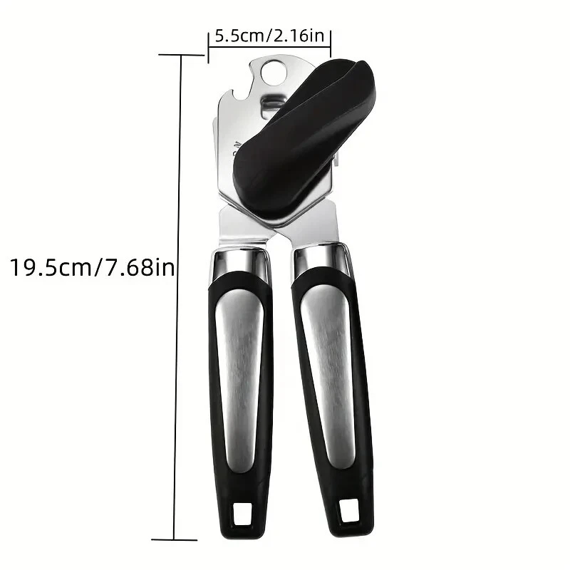 FEATURES: 【Smooth and Safe】- Protect & ensure your fingers safe, smooth and no sharp edge cover make your fingers more safety. Feel free and safe to use by yourself and even your children! 【High Quality Material】- Made from high-quality safe ABS resin stainless steel accessories TRP handle. Ensuring it won't rust or break over the time! The compact and smart design makes it a perfect fit for your kitchen drawers and cabinet. 【Ergonomic Design】- A big easy turning knob and a good comfortable crank handle makes cutting open cans effortless, fast and simple.Portable and Light Weight: Appropriate size makes this opener easy to carry when you are traveling or camping, it can open all kinds of round and oval cans. 【All-in-One Design】- The multifunctional can opener built-in bottle opener is designed for beer soda and other bottles with caps meet all your needs, The celebratory beer and bottle drinks can be easily opened with a simple pry with the hook. 【Easy to Carry & Store】- It is also convenient for you to hang or storage it with the hole on the handle. 【Stylish & Durable】- The heat-resistant, high-quality chrome head holds up to rigorous use. 【Easy to clean】- When clean the opener, you just need to rinse it under running tap water. SPECIFICATIONS: Material: ABS resin stainless steel accessories TPR handle Color: Black weight:160g /0.35lb Size: 19cm / 7.48 in PACKAGE INCLUDES: 1 * Smooth Edge Can Opener