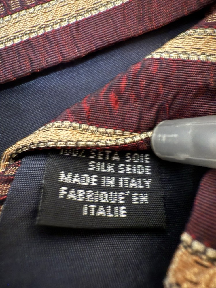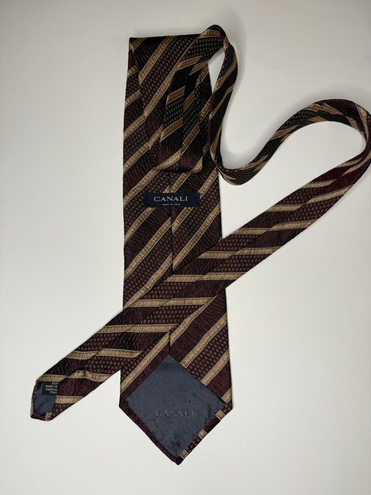 The CANALI Men's 100% Silk Necktie is a high-quality designer accessory exuding luxury and sophistication. Made in Italy with woven red and gold stripes, this classic tie measures 59" in length and 3 1/2" in width, making it a timeless piece for any man's collection. The Canali brand ensures exceptional craftsmanship and attention to detail, perfect for adding a touch of Italian style to any outfit.