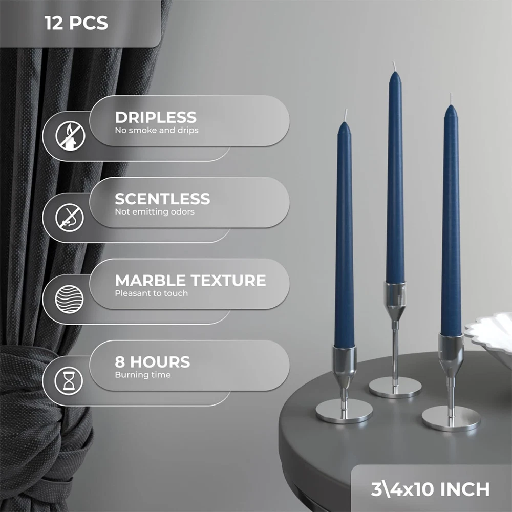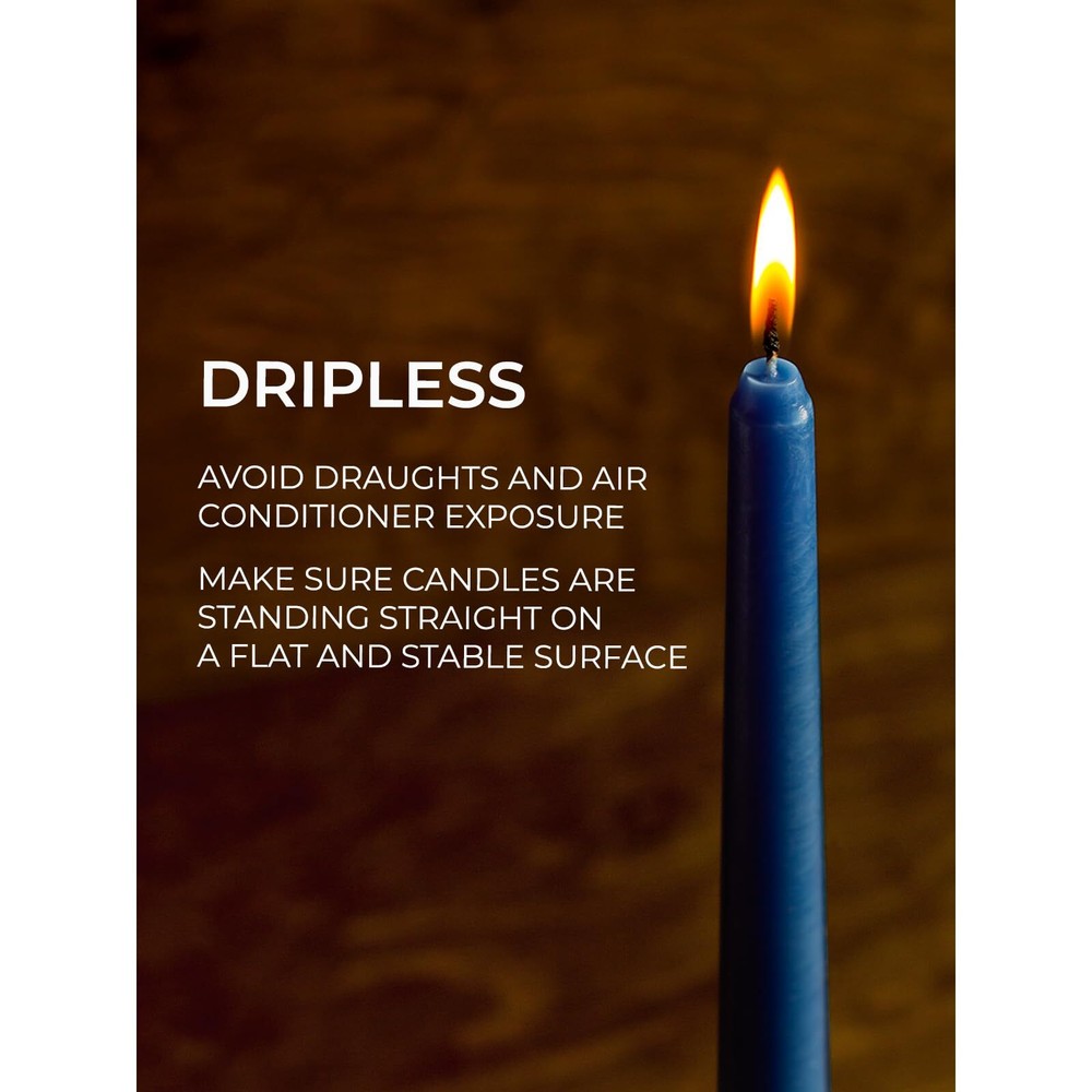 1. These taper candles are fantastic—clean-burning, dripless, and long-lasting. The rich navy blue adds elegance to any setting, perfect for dinners, decor, or relaxation. High-quality wax ensures a steady flame without smoke or mess. A great value for a set of 12!